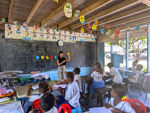 上瀧桃佳さん(ソロモン派遣、職種:小学校教育、千葉県出身)は、ガダルカナル州のセントメリー・タナガイ小学校にて、算数教育の質向上に取り組みました。教員の授業力向上と児童の学習意欲・学力向上を目標に掲げ、現地教員を対象とした研修会を継続的に実施しました。こうした取り組みにより、教員が自ら授業計画を考え、児童主体の授業が行われるようになりました。さらに、児童の学習意欲を高めるために、視覚的にわかりやすい教材やゲームを授業に取り入れるなどの工夫を提案しました。
