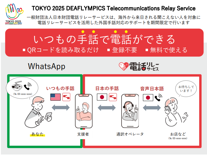 東京2025デフリンピックの期間中に実施される、電話リレーサービスを活用した外国手話対応サポートの仕組み=一般財団法人日本財団電話リレーサービス提供