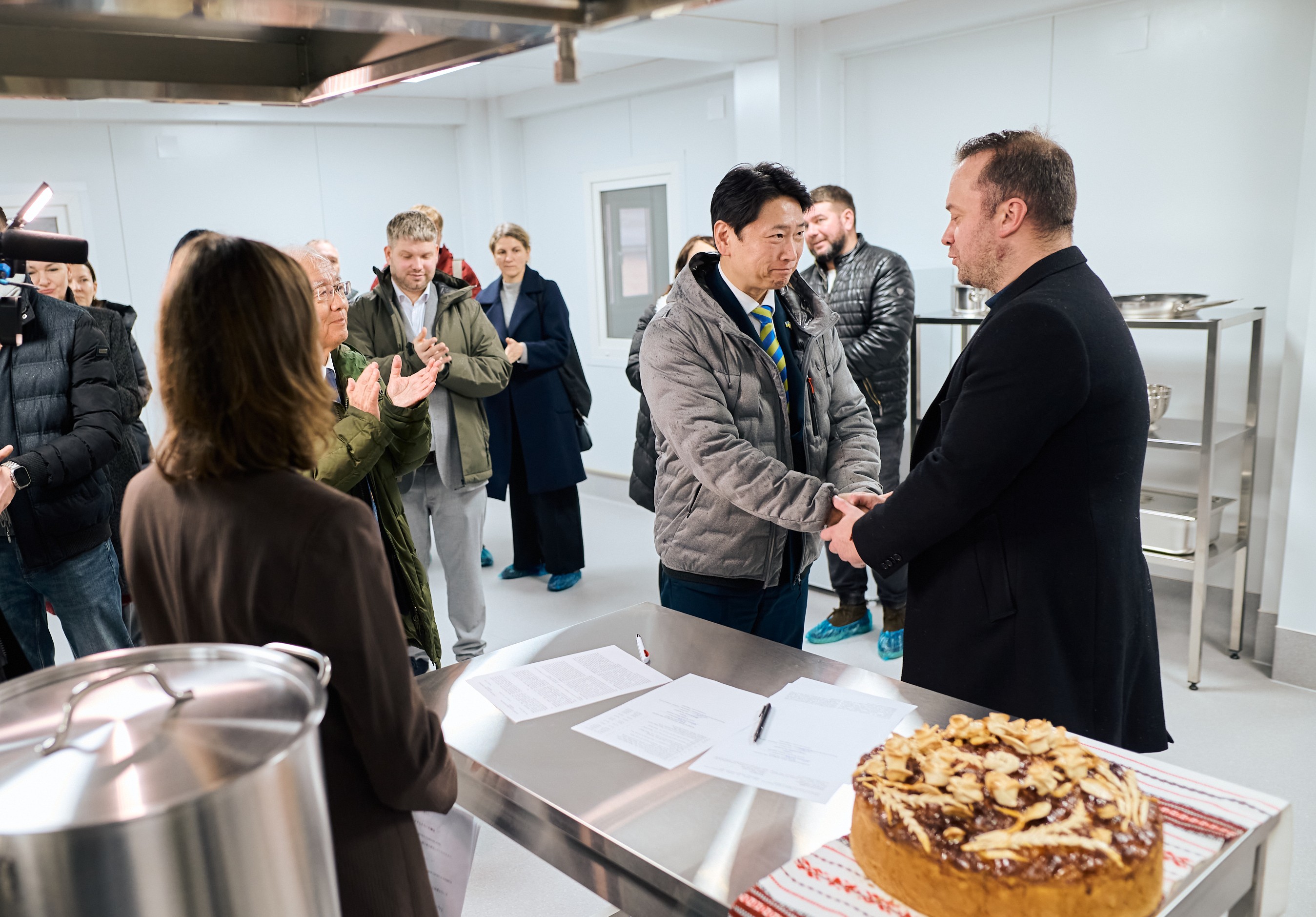 タルプロダクツが建設に関わった給食センターで村長と握手を交わす渡邊社長。