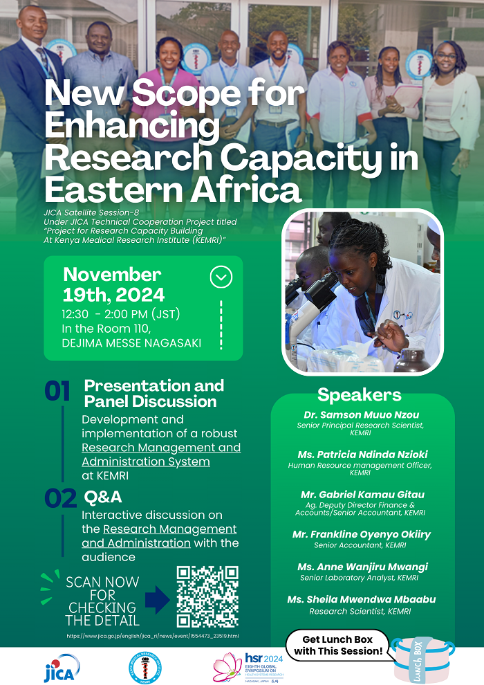 サハラ以南のアフリカの研究能力強化は、国際的に懸念される公衆衛生上の緊急事態 (PHEICs)のようなグローバルな感染症課題に対して極めて重要な役割を果たします。研究管理・運営(Research Management & Administration, RMA)制度および人材の強化は、競争的研究資金の獲得前後のプロセスの効率と効果の向上につながり、ひいては研究者および組織の研究能力強化につながります。リサーチに基づくエビデンスによる国及び域内の保健医療政策提言をミッションとするケニア中央医学研究所(KEMRI)において、RMAの強化が喫緊の課題となっています。