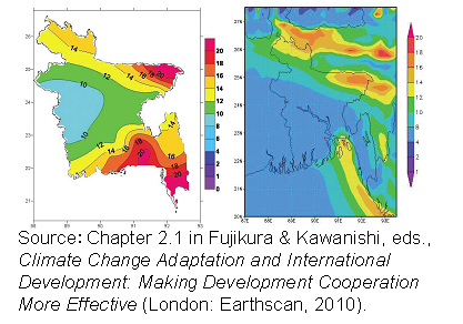 JICAは気象研究所の協力を得て、アジア諸国の担当官を招聘し、気候変動予測モデルの解析能力向上のための技術トレーニングを行った。その一環として、地球シミュレーターを活用し、各国の気温・降水量予測を全球モデルとしては最も解像度が高い20キロメートル・メッシュで行った。シミュレーションで再現した過去のデータを、各研修生が持参した実際の観測データと比較すると、バングラデシュのような平坦な地形の国ではおおむね良い一致が見られたが、インドネシアやフィリピンのように地形が複雑な国では、再現性に改善の余地があることが分かった。