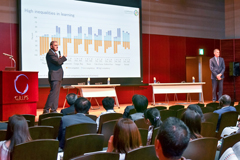 まず、フィルマー共同局長は、「WDR2018のメッセージは、学校に行くことが必ずしも子どもたちの学びに結びついていない、ということ。開発途上国の大半の子どもたちは小学校で習得すべき最低限の読解力や計算力を身に付けていない。これをWDR2018では“学習危機”と呼んでいる」と述べました。学校で身に付けるスキルは労働力として必要なスキルに通じるため、教育は人々が適切な収入を得て貧困から抜け出すのに役立ち、そして国家レベルでは国の生産性を上げ、経済成長を促すとされます。国の投資として教育ほど大きな効果が期待できるものはないものの、十分に行われていない世界の現状をデータで示しながら紹介しました。