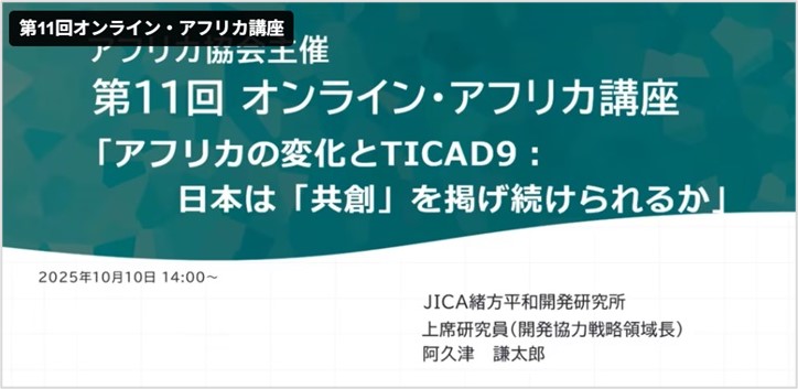 2025年10月10日、JICA緒方貞子平和開発研究所(JICA緒方研究所)の阿久津謙太郎 上席研究員が、一般社団法人アフリカ協会主催の「オンライン・アフリカ講座」第11回 で、「アフリカの変化とTICAD9:日本は『共創』を掲げ続けられるか」と題した講演を行いました。