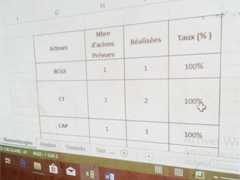 モニタリング会合の様子(ノソンブグ地域)計画した活動の達成状況の確認です。これまでの支援によりモニタリング体制が強化され、無事計画通り活動を実施できています(右端の100(%)が実現率)。