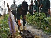 まずは土づくりです。耕運機で土を起こし、畝を立ました。次に畝の一部にプラスチックシートでマルチングをしました。マルチングとは畝の地表面を被う技術で、雑草の繁殖を抑えたり、地温を高く保ち土壌水分を保つ効果があります。今回は地温が上がりやすく、冬場の栽培に適しているポリエチレン製の黒ビニールマルチ、材木廃棄物から作られた炭、敷きわらによる栽培比較試験も実施しています。ビニールマルチは、しわが寄らないように張るのは手足同時に使うテクニックが必要です。ちょうど実習に来ていた農業大学校の学生さんたちがマルチ張りに挑戦したところ、最初は要領を得ずにしわが寄ってしまったのですが、回数を重ねるごとにうまく張れる様になっていきました。マルチを張り終えたら、苗を移植するために適切な間隔でマルチに穴をあけ、ポットから苗を移植し、最初の支柱を立てます。