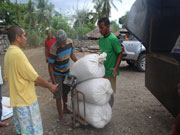 農家からコメを買い取る前に重量を測るアセルダ社のスタッフ。