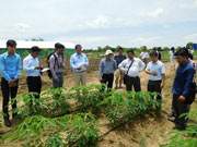 隔離圃場に植えられたキャッサバの生育状況を視察するデモンストレーション参加者