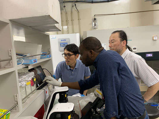 北海道大学の博士課程在学中のINRB職員Dr. Yannick MUNYEKUと吉河先生のディスカッション