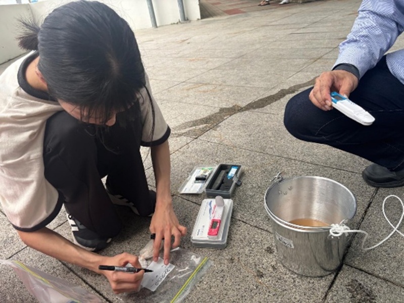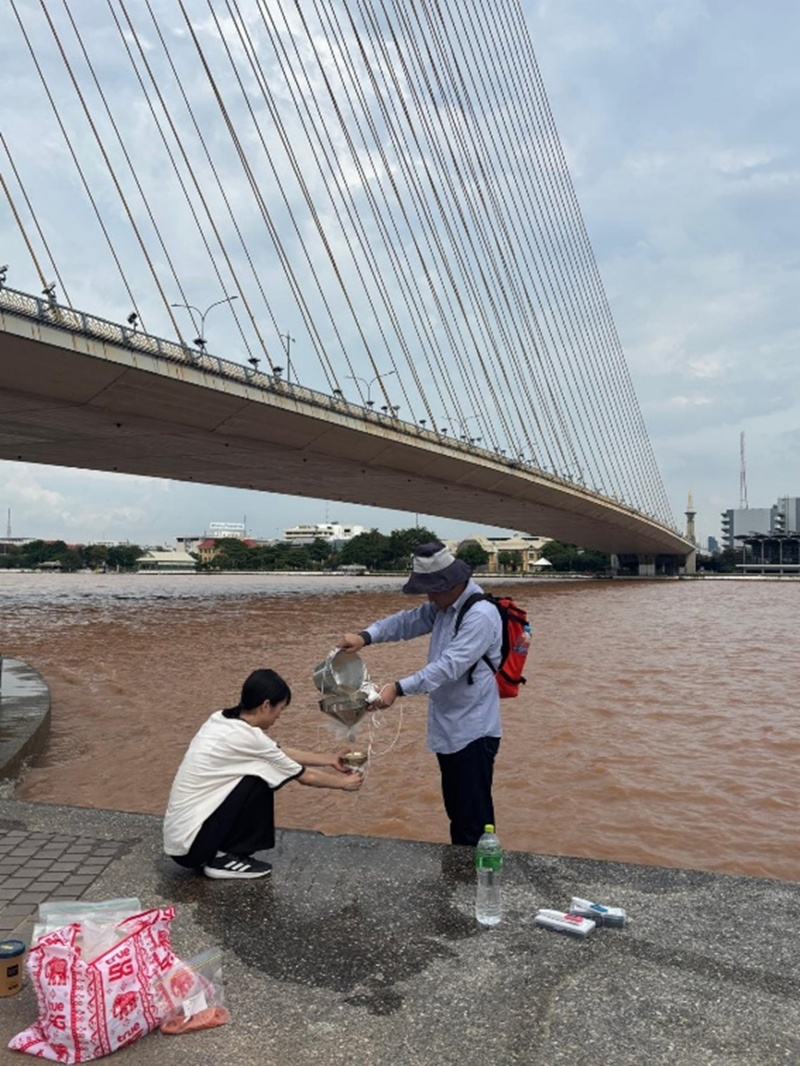 2025年10月10日には、チャオプラヤ川沿岸の5か所で採水を行い、河川水中に含まれる極微小MPsおよびナノプラスチックの試料を採取しました。また、電気伝導度とpHを用いた簡易的な水質測定も併せて行いました。