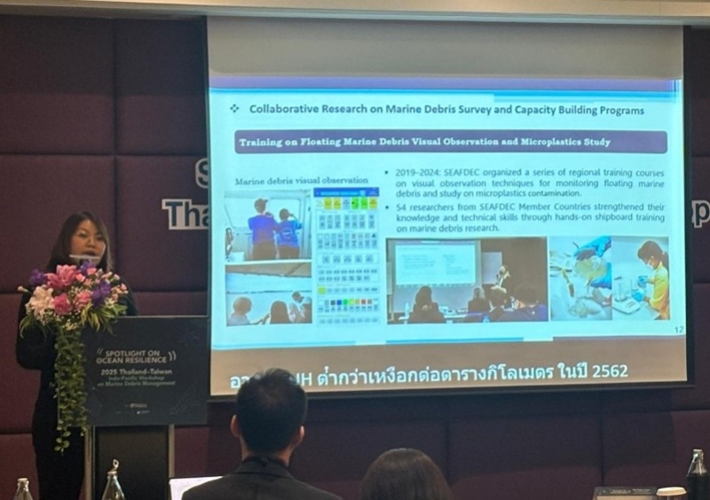 2025年11月5日、バンコクで開催された海洋ごみ対策に関する国際会議「SPOTLIGHT ON OCEAN RESILIENCE―Indo-Pacific Workshop on Marine Debris Management」において、当プロジェクトのメンバーであるPontipa氏(東南アジア漁業開発センター:SEAFDEC)およびプロジェクトマネージャーのSuchana教授(チュラロンコン大学)が発表を行いました。