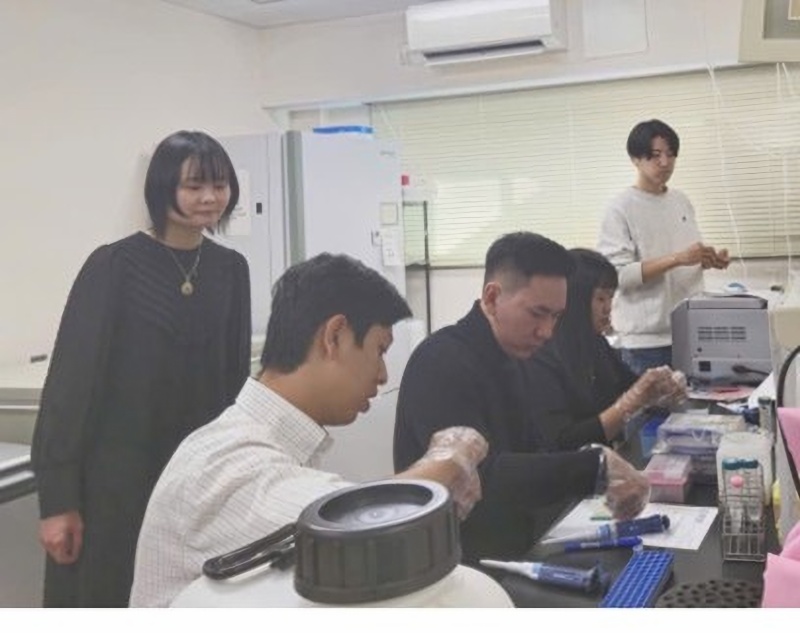 写真3.新潟大学農学部ラボにて指導を受けるCTU学生たち