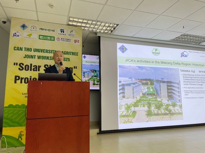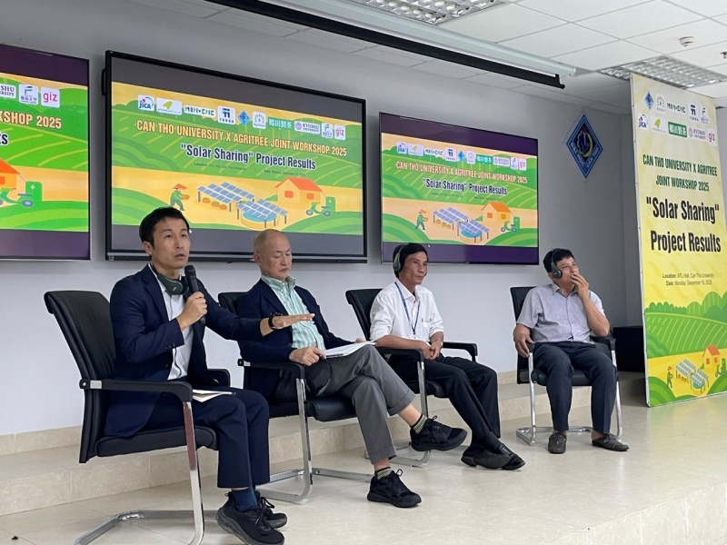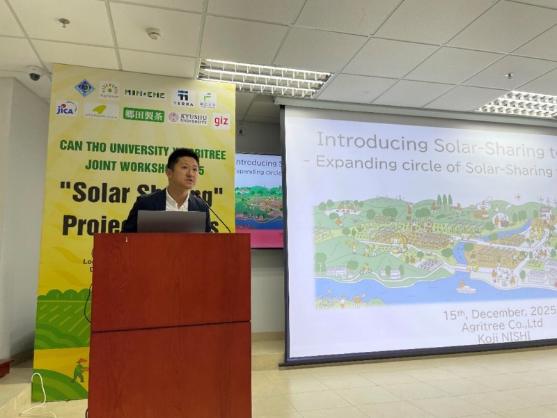 本プロジェクトのカウンターパートであるカントー大学(CTU)との協力覚書を締結し(プロジェクトニュースレター64号参照)、本プロジェクトが目指す産官学連携活動にもご協力いただいている株式会社アグリツリーが、「ソーラーシェアリング」に関する研究報告会をCTUで開催しました。会場となった講堂のある先端研究棟(Advanced Technology Laboratory)は、日本政府による有償資金協力(円借款)事業で建てられたものです(プロジェクトニュースレター22号参照)。なお、今回研究発表の元となった各種試験は、経済産業省「グローバルサウス未来志向型共創等事業」による「ベトナム社会主義共和国/農林水産業の気候変動適応及び農村の電力インフラ強化に資するソーラーシェアリング実証事業」によるものです。