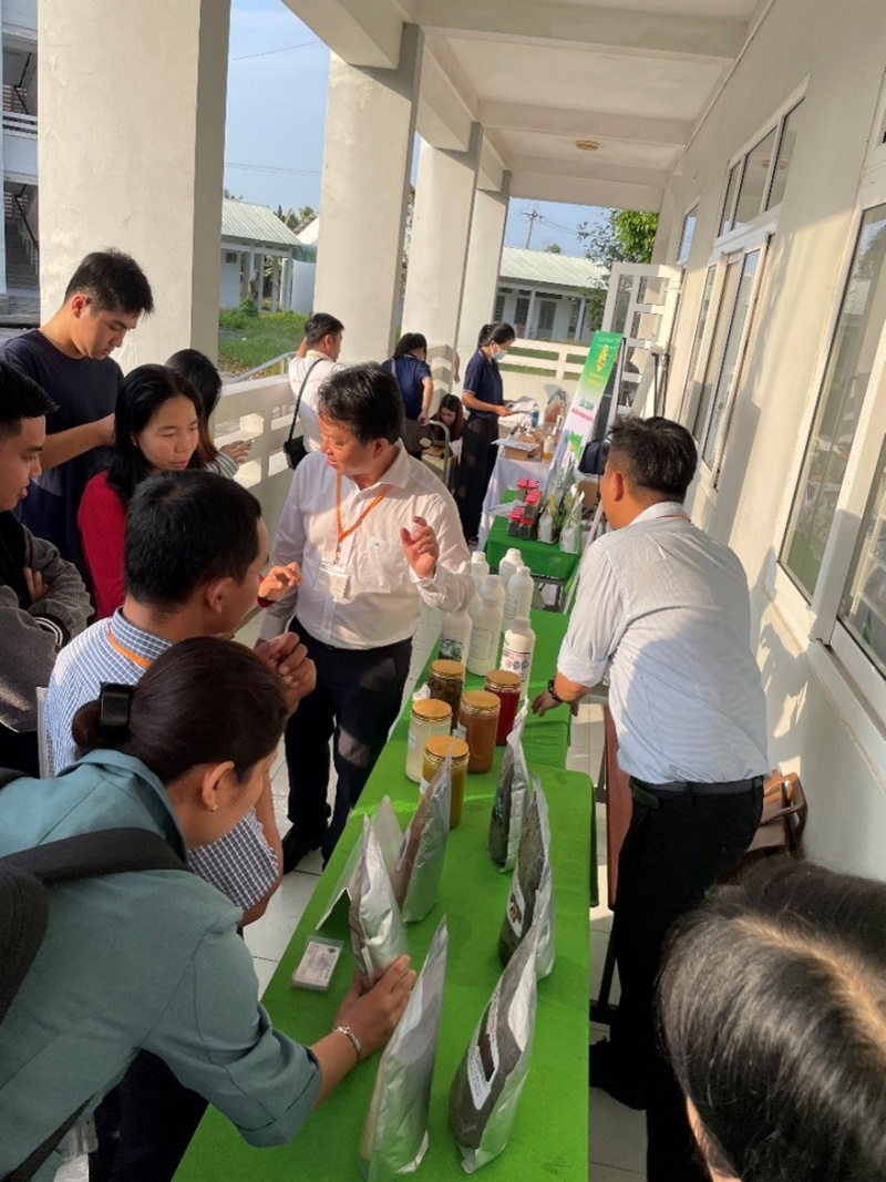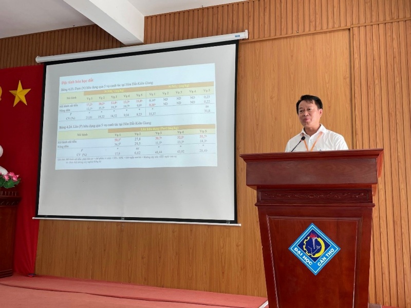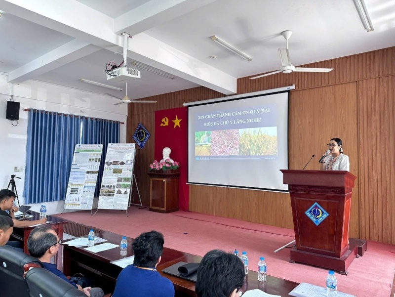 研究モデル1「ベトナム・メコンデルタ地域に適した持続型農業システムの開発と応用」では、微生物資材と有機肥料を活用し、化学肥料の使用を抑えながら、不耕起栽培および間断灌漑(Alternate Wetting and Drying: AWD)を組み合わせ、塩水遡上地域でも温室効果ガス排出を抑えつつ稲作を持続するモデルの構築を目指しています。この研究成果を踏まえた稲作モデルをより多くの農家の方に知ってもらうべく、カントー大学(CTU)のホアアンキャンパスでワークショップを行いました。Nguyễn Khởi Nghĩa准教授(農学部)、そしてChâu Thị Anh Thy博士らによる発表が行われました。