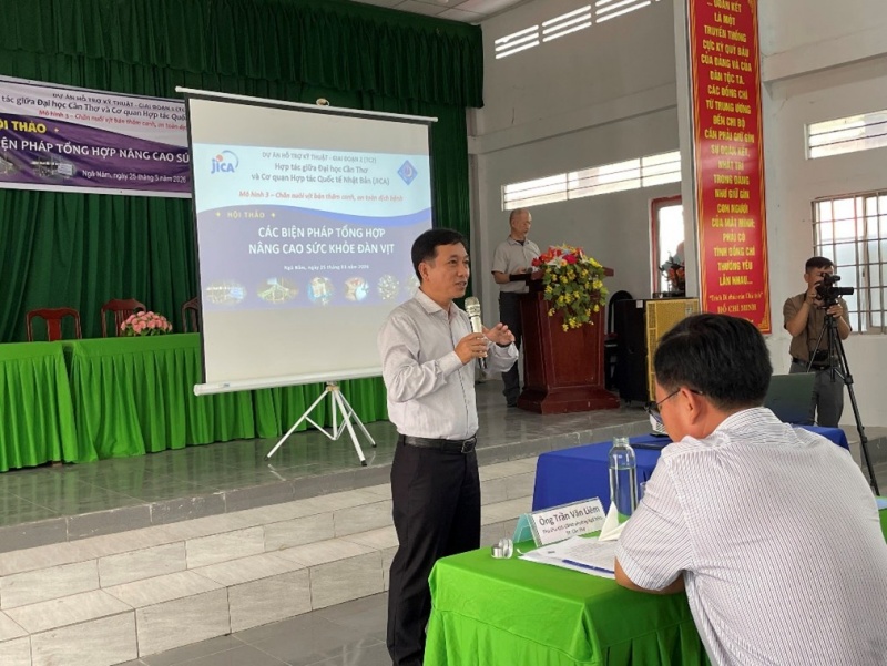 本プロジェクトが支援する技術モデルの一つ「モデル3:感染症対策を含む持続的かつ半集約的なアヒル生産方法の開発」では、カントー大学(CTU)農学部Nguyễn Trọng Ngữ教授の研究グループが中心となり、各地で有用微生物(プロバイオティクス)を活用した半集約的かつ安全にアヒルを生産する方法を確立する試みを進めています。今回はその研究成果発表会をカントー市Ngã Năm(旧ソクチャン省)で行いました。