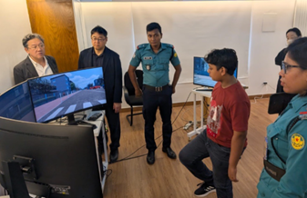 TSECには、バングラデシュで初めて導入される、最先端のバーチャル交通安全教育シミュレータが設置されています。このシミュレータは(一財)日本交通安全教育普及協会(JATRAS)が開発したもので、現地の人々が学びやすいように言語や交通標識などが現地仕様に改良されています。受講者は、自動車・自転車・歩行者の3つの立場から交通上の危険を予測し、安全な行動を取る方法を学ぶことができます。