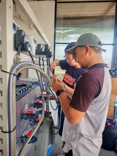 Dr.Kubota and Dr. Morikawa together with Dr. Pairaya (Khon Kaen Univ.) worked a research site in a starch factory where the Bench scale reactors for methane fermentation of duckweed and industrial wastewater was installed. After adjusting a flow and water level of the reactor and gas traps, an inflow of wastewater into the reactors got started. They installed live-webcams to remotely watch the reactors.