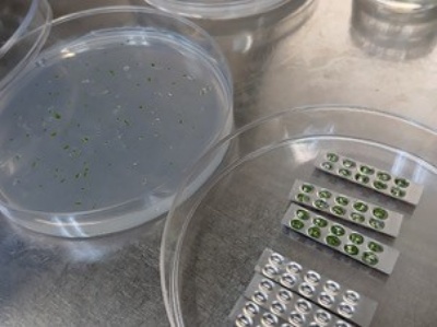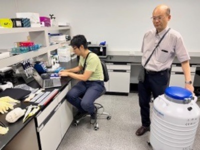 さらに伊藤助教はタイ側のG3チームが取得・維持しているウキクサ植物をDr. Peerapatと所属する学生のMs. Chomphoonut と共同で液体窒素 を⽤いた急速凍結(ガラス化法)保存を⾏いました。今回は、ウキクサ表面の滅菌を徹底し、前培養にショ糖を含んだ培地を使用することで、健康に生育した植物体を用いました。今回の滞在では、前回までに保存に成功した3種のウキクサ植物(Spirodela polyrhiza, Landoltia punctata, Lemna aequinoctialis)に加えて、タイに自生している4番目の種であり、高タンパクのスーパーフードとして食用にも用いられているWolffia globosaの凍結保存にも挑戦しました。⼀部のサンプルについては短時間の保存のあとに急速解凍し、⼗分な⽣存率の有無を確認中です。以前から保存していた株も含め、現在DHbRCでは、4種19クローンのウキクサを、重複を含め合計58本のチューブで凍結保存しています。