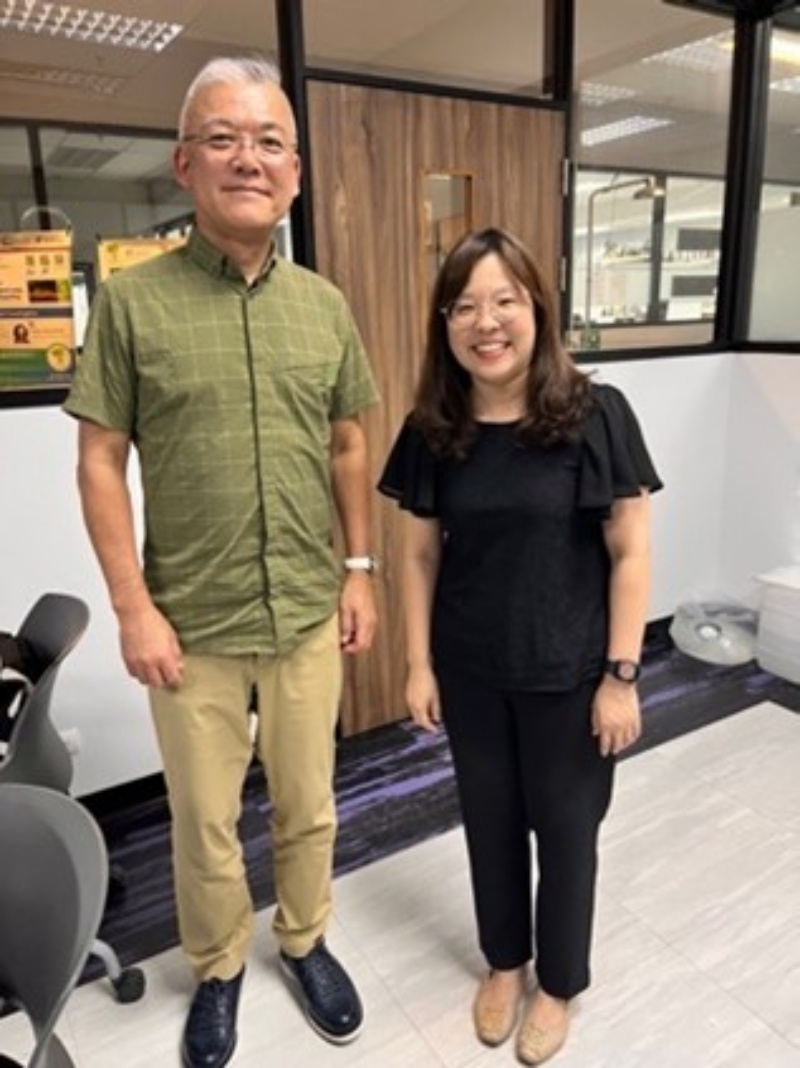 研究題目4「ウキクサを原料とした有価物生産技術基盤の開発(Group4)(4)機能性食品」の研究代表者であるAssist Prof. Dr. Suvimol CharoensiddhiとDHbRCオフィスにて、活動項目「4.15ヒトの健康に有効な活性物質を開発する」について打ち合わせを行った【写真5】。その結果、研究は順調に進展し、期待を上回る成果を挙げていることを確認した。特に、マウスを用いた肥満抑制効果やヒト組織細胞培養を用いた腸管バリアの強化効果など、食用ウキクサの有効性について報告を受けた。今年度、研究成果を原著論文としてFuture Food誌に1報, Food Chemistry Advances誌に2報を発表したことは高く評価できる。