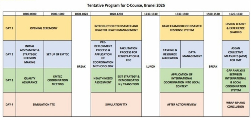 ARCHプロジェクトの重要なアウトプットの一つである標準訓練の開発は、プロジェクトワーキンググループ(PWG)2の元に形成されたサブワーキンググループにて、タイと日本が主導して進められてきました。開発されたコースは、①災害保健医療基礎コース(Basic Course on Disaster Health Management:Bコース)と、②EMT (緊急医療チーム) Coordination Course:Cコースで、2023年には両コースともAMS参加者向けに試行開催に漕ぎ着けました。Bコースはタイに続いてシンガポール、フィリピンがそれぞれ標準カリキュラムを参考に国内で実施しましたが、ブルネイでの実施は、主に本邦研修 (Knowledge Co-creation Training: KCCP)参加者により提案・実施推進され、2025年5月17日‐20日の日程にて開催に至りました。