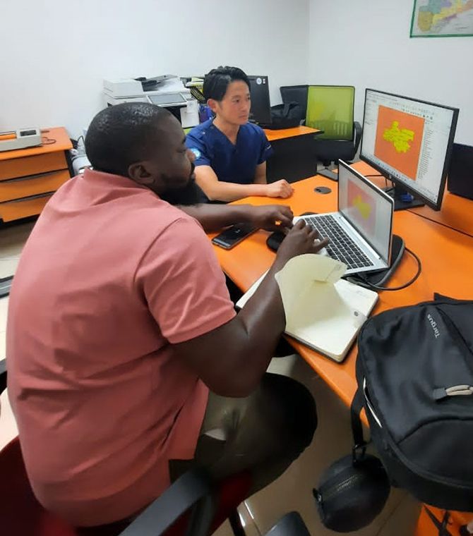 ①ザンビア国立衛生研究所(Zambia National Public Health Institute:ZNPHI)の感染症専門家とコレラ流行状況を示すコレラ地図の作成を行う今村専門家