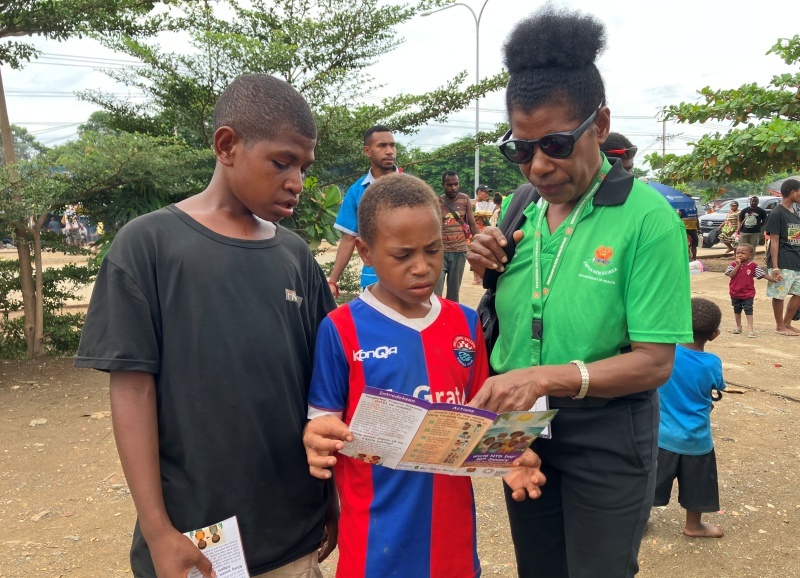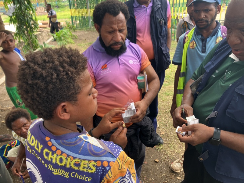 本プロジェクトは、PNG保健省やWHO等と連携し、今年の「世界NTDの日」に合わせて以下の活動を実施しました。具体的には、 NTDsの認知度向上を目的 として、広報資材(掲示ポスター、パンフレット)の作成や本行事用キャンペーンポロシャツのデザインおよび一部調達の支援を行うとともに、ラジオ放送局での情報発信や地域における啓発活動への参加を通じてNTDs対策を支援しました。また、PNG保健省が各ラジオ放送局との調整を行うとともに、首都行政区(National Capital District: NCD)州保健局(PHA)やNGO団体であるThe Leprosy Mission(TLM)等と積極的に連携し、啓発活動の実施を進めました。地域コミュニティでの啓発活動の中では、風土病性トレポネーマ症(Yaws)の症例がいくつか確認され、PHAがその場で治療薬のアジスロマイシン(Azithromycin)を提供する場面も見られました。