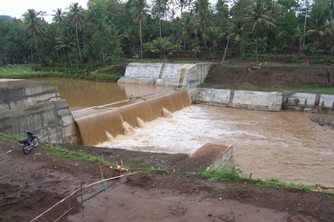 建設された砂防ダム。東部ジャワ州ブランタス川の上流の河道安定化を目的として設置された。