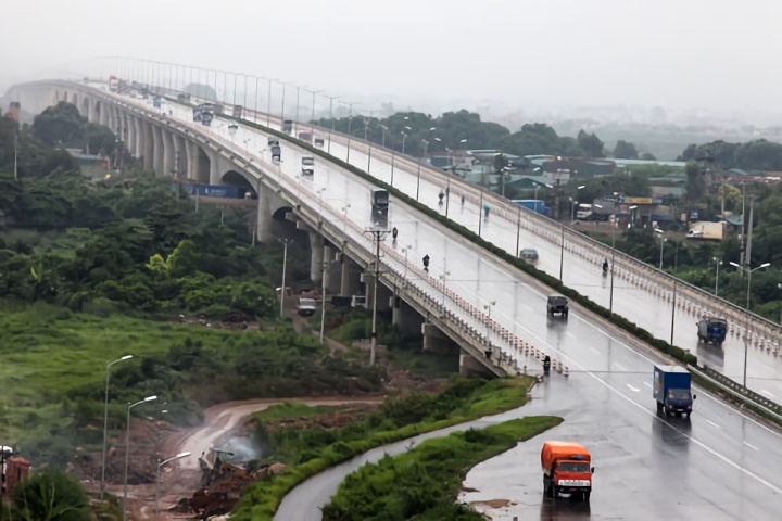 ベトナムの首都ハノイ市内を流れる紅河には当時橋梁が3本しかなく、国道1号線および国道5号線を通じて南部方面およびハイフォン市方面から同市内へ入る交通量の増加に伴い、交通渋滞の深刻化が懸念されていました。この協力(第1期)では、同市中心部を囲む環状道路3号線のうち、紅河に架かる新橋と国道1号線と国道5号線を結ぶバイパス道路の建設を支援しました。これにより、ハノイ市内の交通渋滞の解消および物流の効率化を図り、北部地域の物流の改善にも寄与しました。