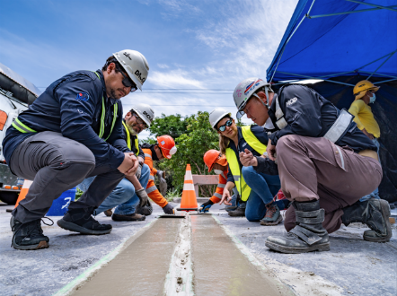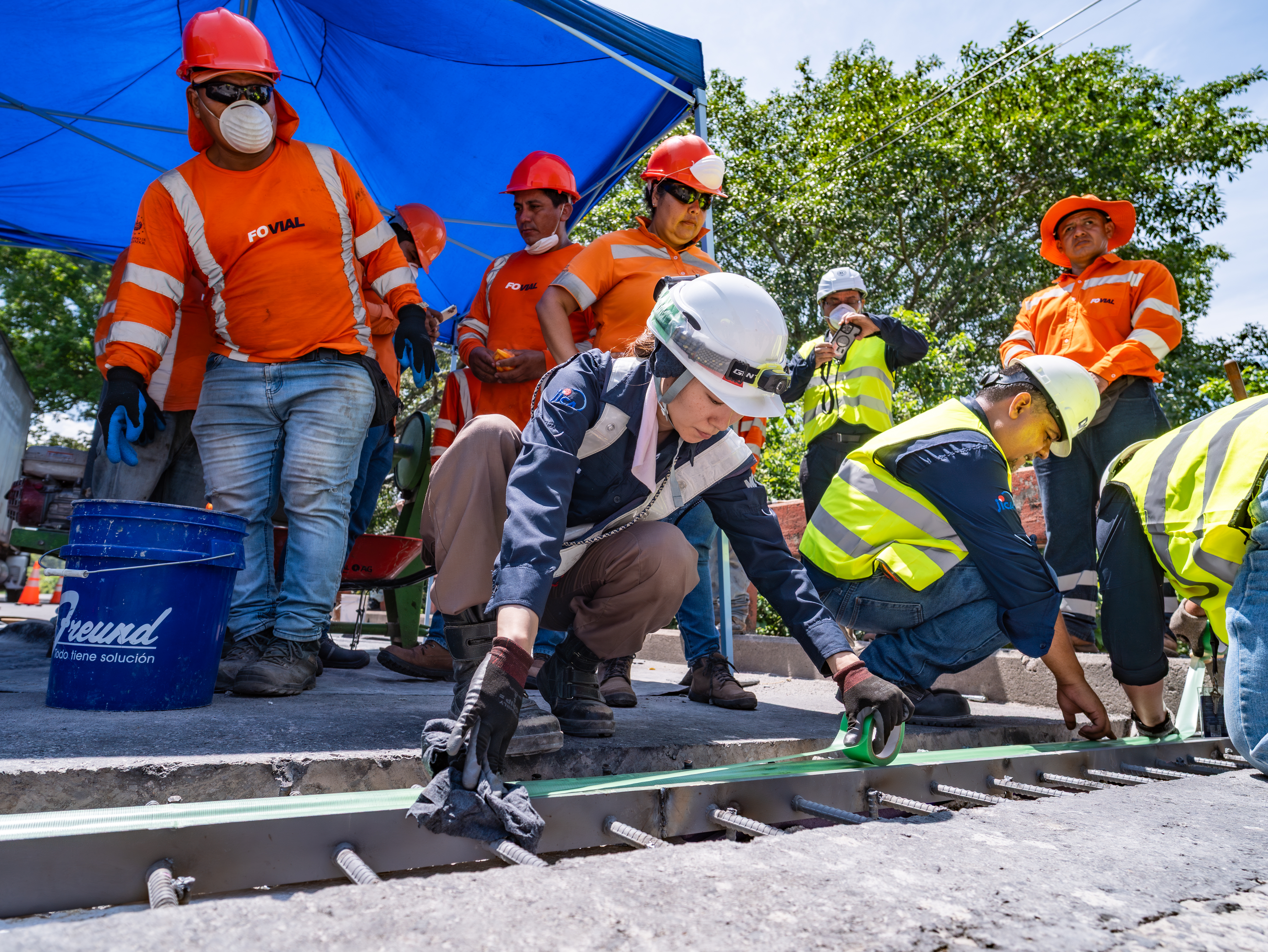 また、気温の上昇等により発生する伸び縮みで橋が損傷しないために、道路と橋梁の間に取り付ける伸縮装置に関するパイロット事業では、プロジェクトのカウンターパート機関である公共事業省・気候変動リスク管理戦略局(DACGER)をはじめとする、公共事業建設維持局(DCMOP)、道路保全基金(FOVIAL)、運輸交通副省(VMT)が連携し、施工と交通整備を行いました。日本製の伸縮装置や超速硬コンクリートが活用され、交通規制下の安全管理および交通早期解放の手法を習得しました。