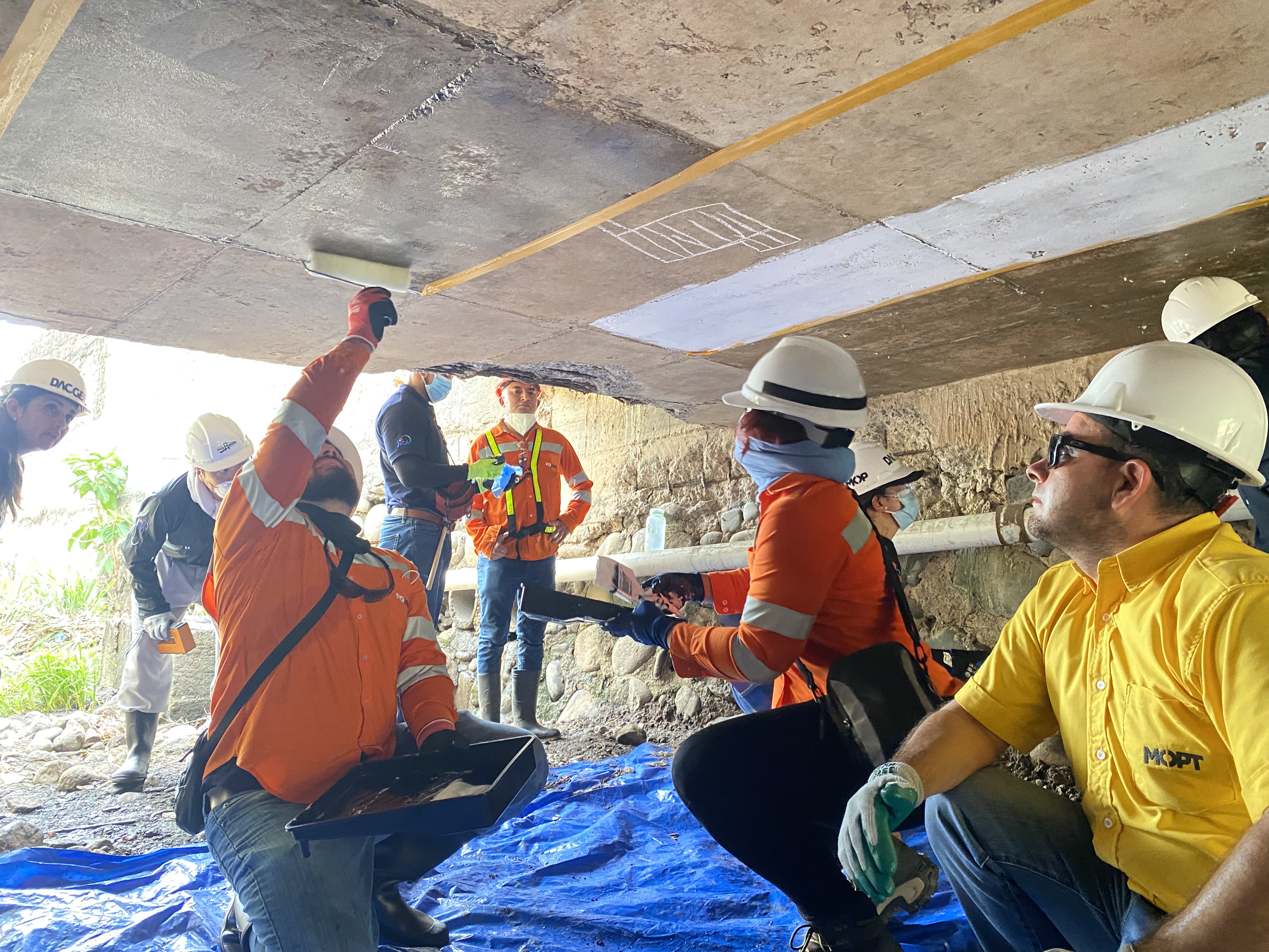 HASHIMORIプロジェクトでは、エルサルバドルの橋梁維持管理に従事する技術者の能力向上を目指し、日本人専門家の指導のもと、On the Job Training(OJT)を実施しました。このトレーニングでは、橋梁の点検、診断、予防保全に関する技術移転が行われ、特に交通量が多い中、経年劣化や塩害により損傷を受けたコンクリートの補修技術が導入されました。