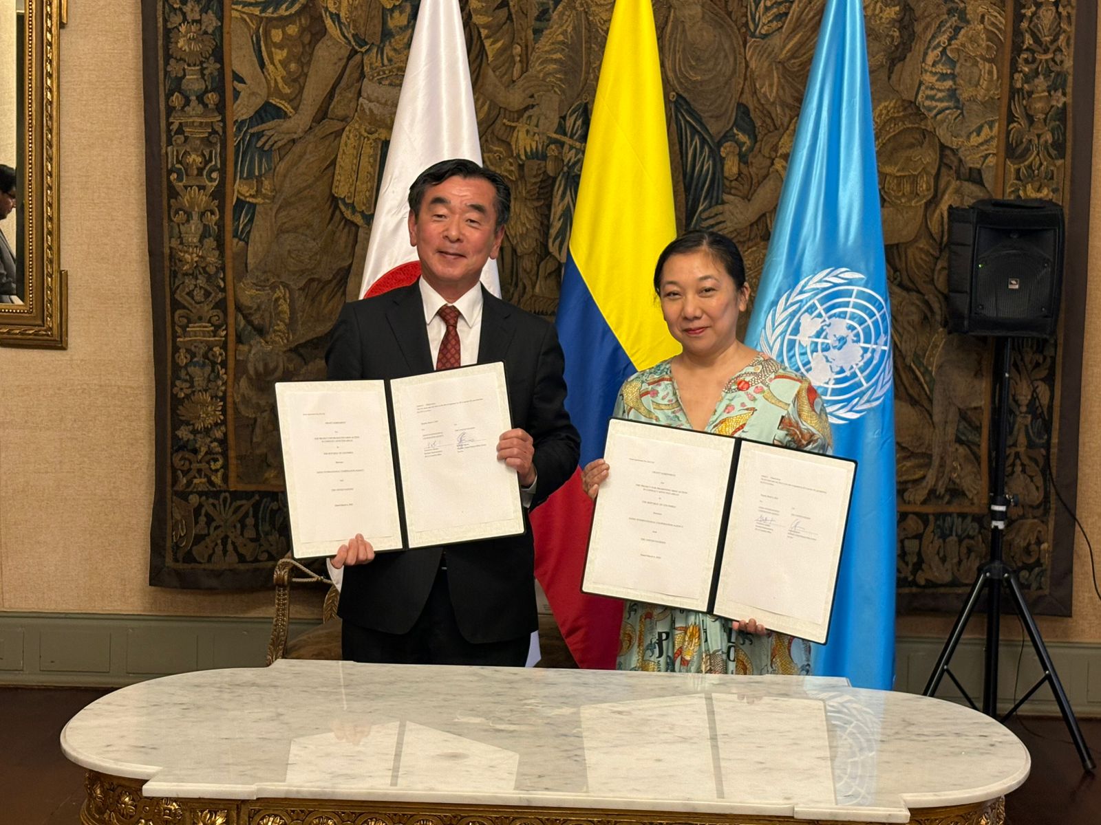 国際協力機構(JICA)は、2026年3月6日、コロンビア共和国ボゴタ市にて、国連地雷対策サービス部(以下、UNMAS )との間で、「紛争の影響を受けた地域における地雷対策促進計画(UN連携/UNMAS実施)」を対象として、無償資金協力の贈与契約(Grant Agreement: G/A)を締結しました。当日の署名は、 UNMASの小川和美部長とJICAコロンビア支所の山田章彦支所長の間で取り交わされました 。本件は、2025年6月に締結されたJICAとUNMASの覚書に基づく、中南米地域で初の連携案件となります。