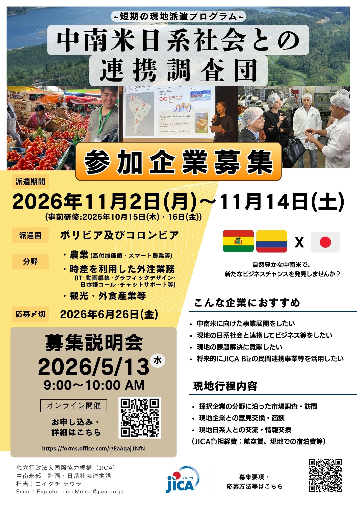 【応募〆切:6月26日(金)正午】2026年度「中南米日系社会との連携調査団(ボリビア・コロンビア派遣)」参加企業等募集