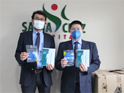 完成したガイドラインと共に。左から、佐藤洋史事務所長、辻マルセロ病院長
