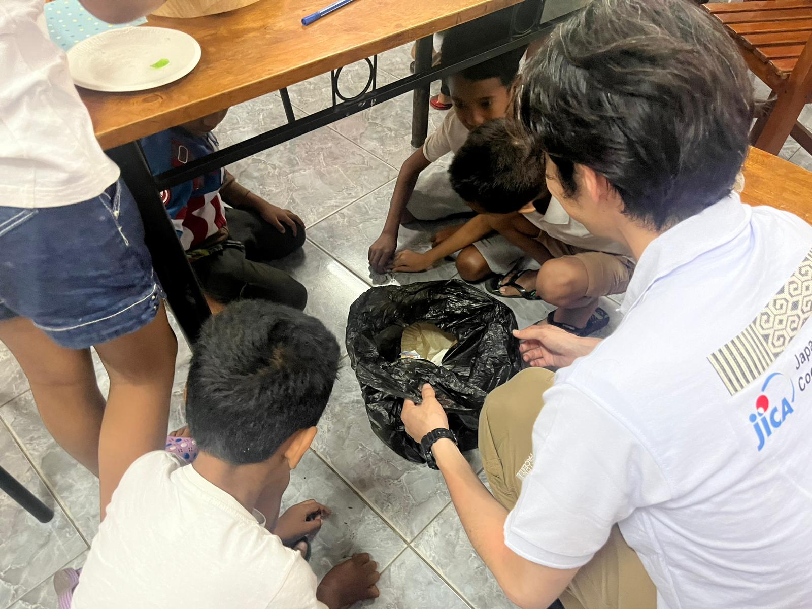 私の主な業務は日本語を教えることですが、それ以前に彼らにもっと知ってほしいことがあると思い、ごみに関する授業をおこないたいと考えました。子どもたちに「ごみはごみ箱に捨てよう」というのは簡単ですが、大事なのは「なぜ」の部分。彼らの強い好奇心にこたえられる授業をしたいと思い、實亜里紗さん(2023年度3次隊、環境教育)に協力を仰ぎ、環境教育の出前授業を実施することにしました。