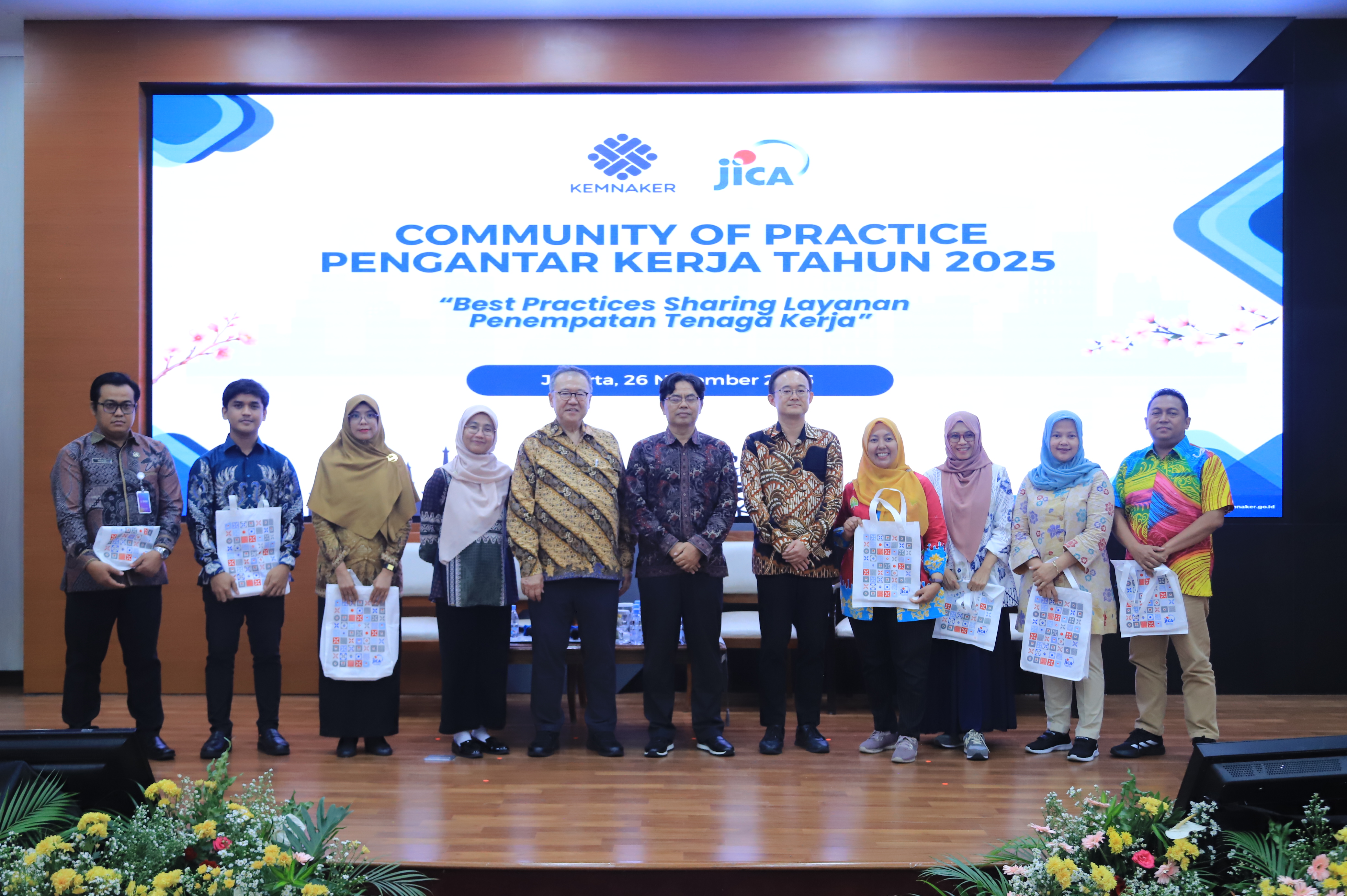 国際協力機構(JICA)は、インドネシア共和国労働省職業紹介・労働機会拡大総局(Binapenta & PKK)と協力し、2025年11月26日(水)、ジャカルタのインドネシア労働省において「公共職業サービス職員向け研修Community of Practice(CoP)2025」を開催しました。今回は「職業紹介サービスにおけるベストプラクティス共有」をテーマとして、インドネシア全国の職業紹介担当者が知見と経験を共有し、革新的な取り組みを発表することを目的として開催され、会場で約125名、オンラインで約500名を超える関係者が参加しました。