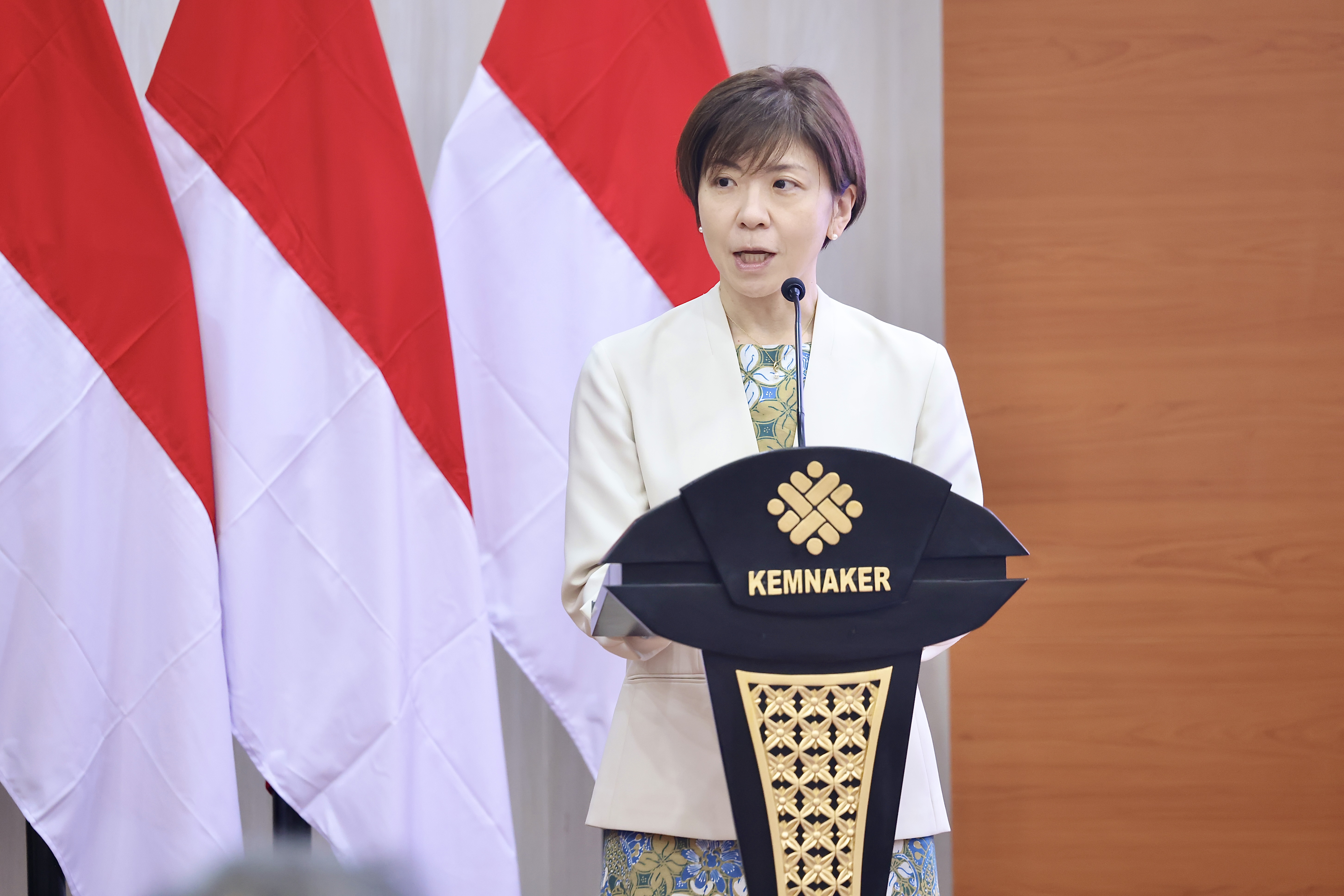 開会式には、インドネシア共和国労働大臣ヤシエルリ氏、JICAインドネシア事務所竹田所長、全国社会保険労務士会連合会会長若林正清氏、そしてインドネシア労働省職業紹介・労働機会拡大総局長代行エスティアルティ・ハルヤニ氏が出席しました。