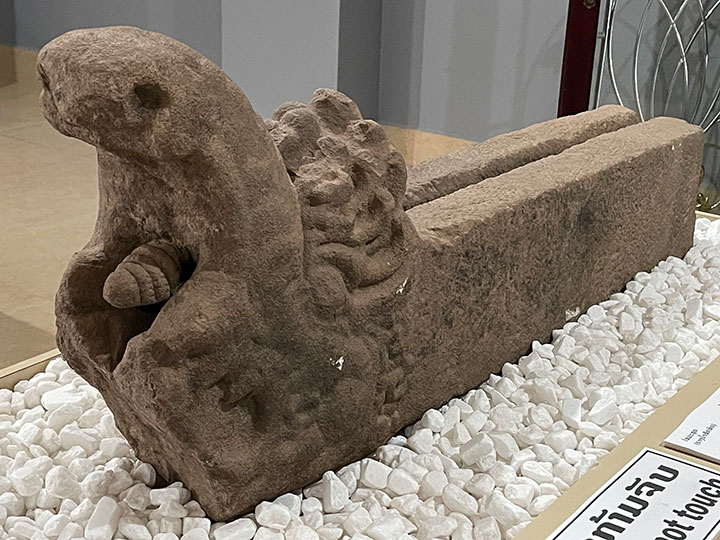 写真4は「ソーマスートラ」と呼ばれ、清めに使われた水をヒンドゥー教寺院などの聖なる場所から外に排出するための石造りの排水設備(樋)です。先端部には「マカラ」と呼ばれるインド神話のワニに似た怪魚の頭が彫刻されています。長く尖った口を大きく開けた先端から水が流れ落ちるデザインです。マカラが彫刻されたタイプの排水設備は、古代クメール期以前の古い様式で7世紀頃のものと推定されます。いずれもラオス南部のチャンパーサック地方のワット・プー遺跡(世界文化遺産)で見つかったものです。
