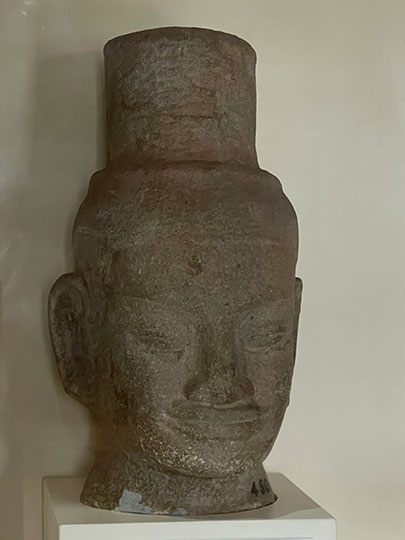 写真5・6・7は、代表的なヒンドゥー教の神々であるビシュヌ神・シヴァ神・ガネーシャ神の石造彫刻像です。クメール王朝ではヒンドゥー教が取り入れられました。その影響下にあったチャンパーサック地方でもヒンドゥー教寺院などでこれらの神象が普及しました。ワット・プー遺跡で見つかったものです。11~13世紀頃の作品と推定されます。