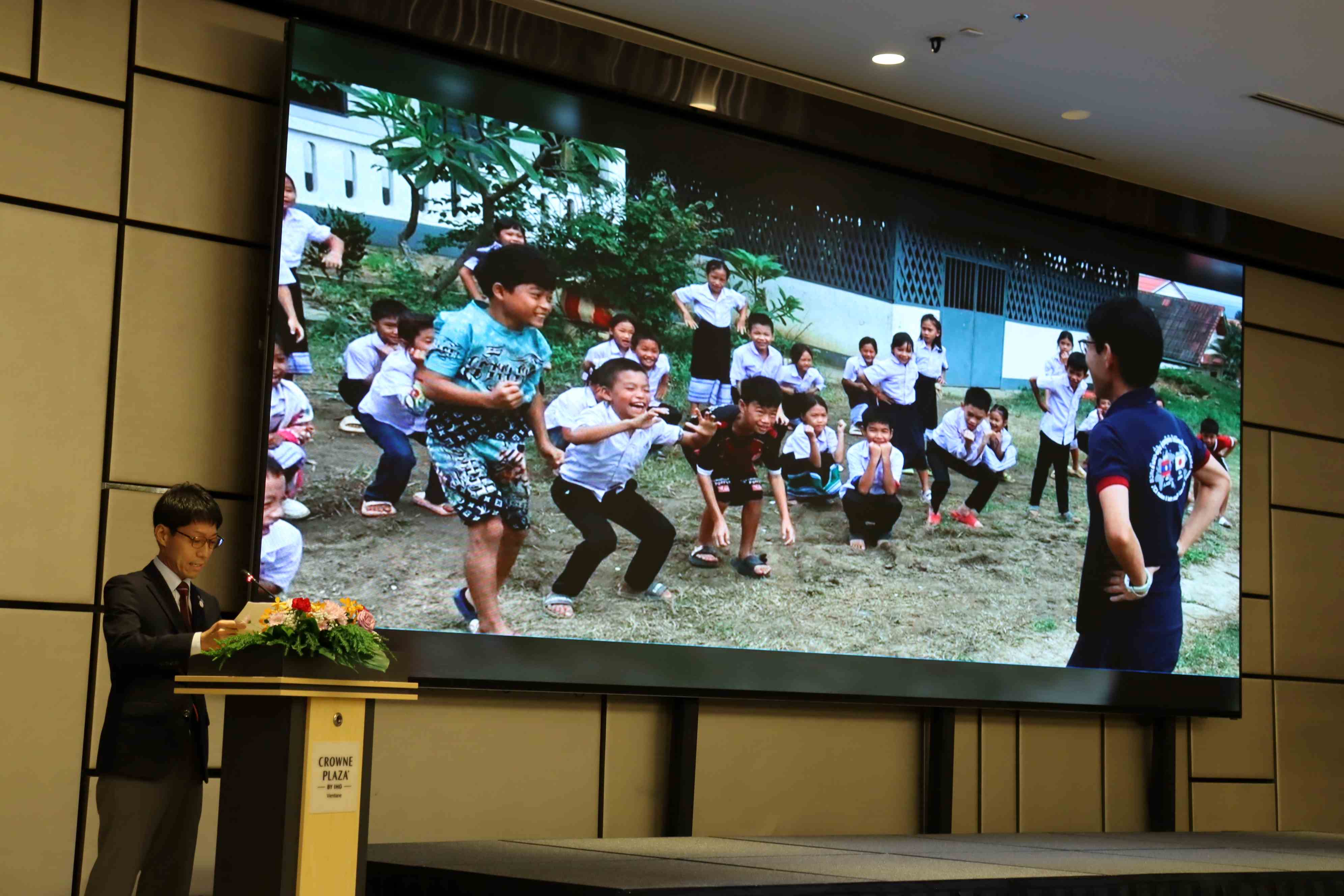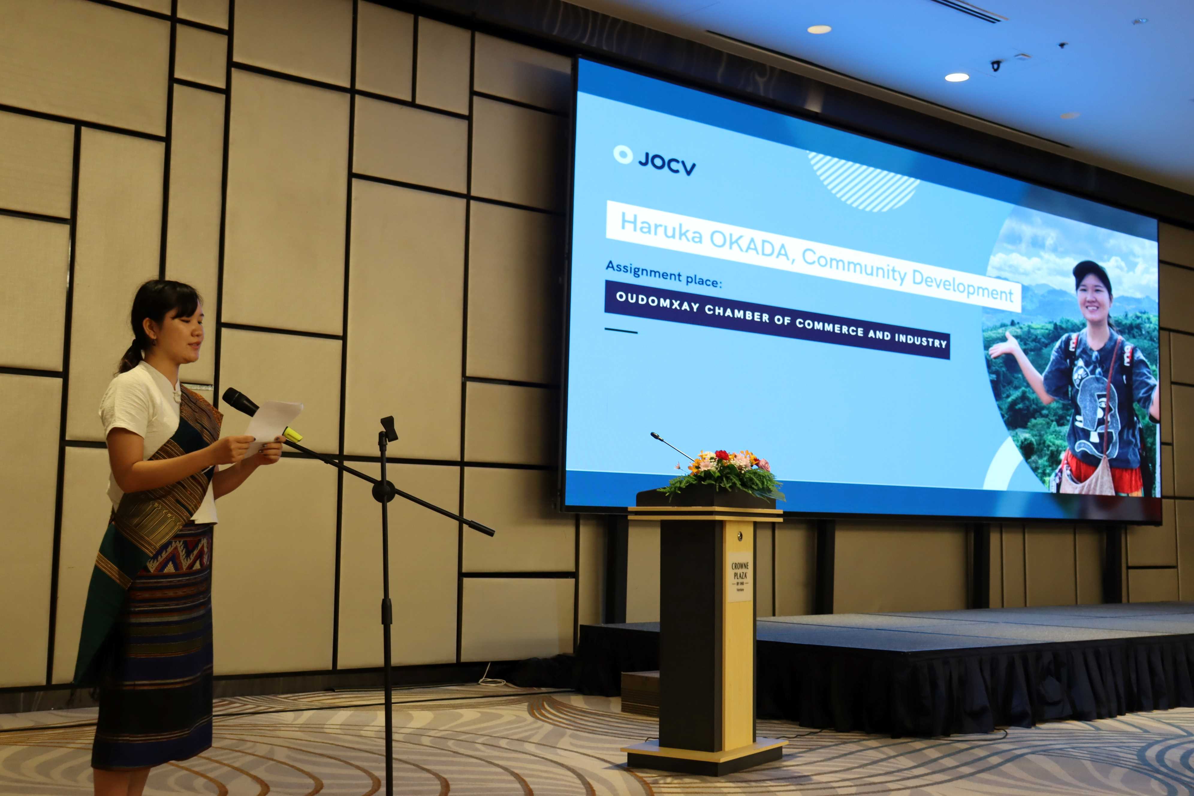 また、現在活動中の2名の隊員が、流ちょうなラオ語でスピーチを行いました。ウドムサイ県の商工会議所で活動している岡田葉留佳隊員は、ラオスの伝統工芸品の継承のため、商品のデザイン改善や販路拡大に取り組んでおり、ラオスのハンディクラフトの価値が世界的に認知されるようにしていきたいと話しました。ルアンパバーン県の子ども文化センターで活動している久野純平隊員は、ラオス伝統文化の継承・子どもの情操教育のため、ラオスの伝統舞踊や伝統楽器の指導のサポートや日本との交流に取り組んでいることを報告し、引き続き、子ども達が持つ潜在的なポテンシャルを引き出すことができるよう、ラオスの人々と協力していきたいと話しました。