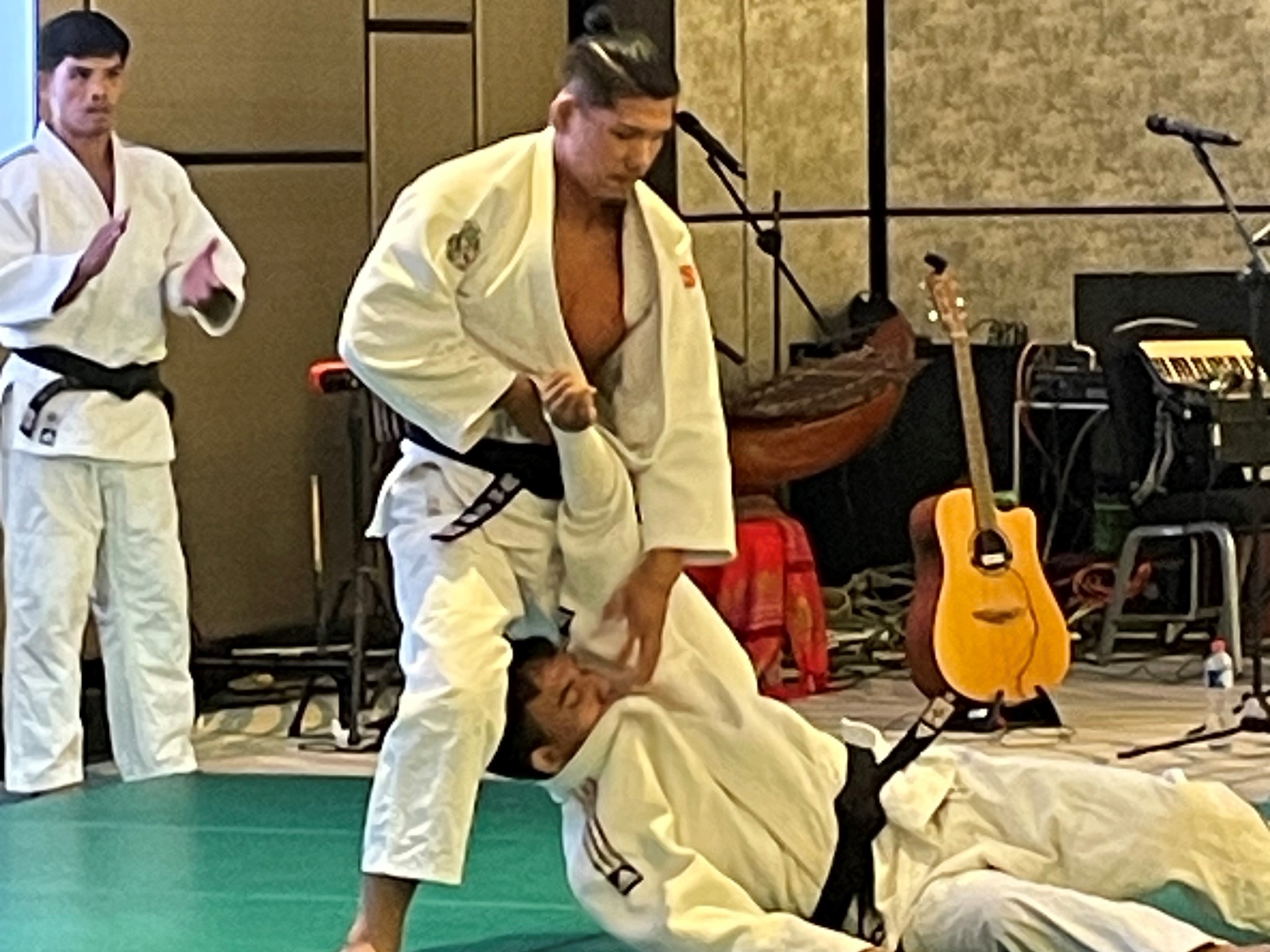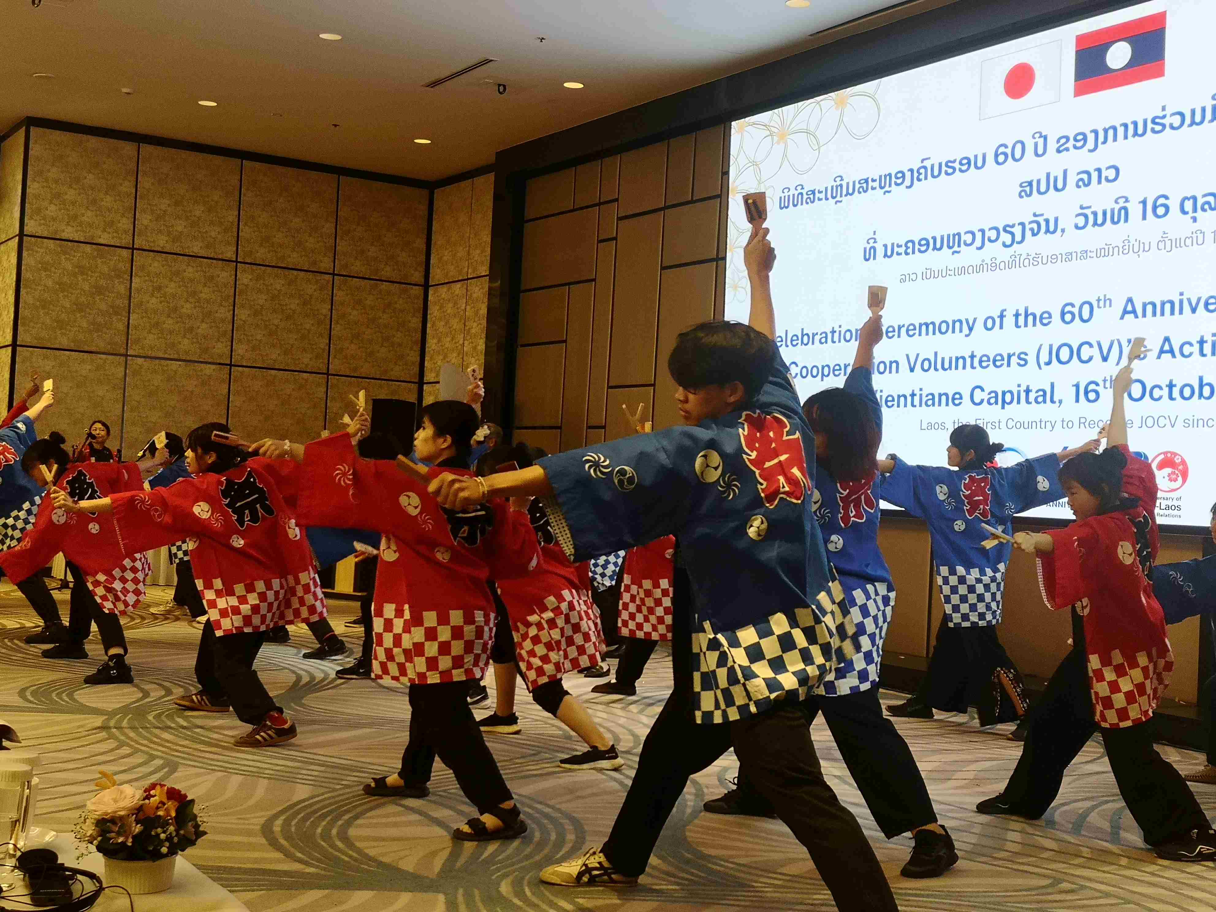 式典の後半には、ラオス柔道連盟から、柔道の指導・普及活動を行っている菊地友輝隊員による迫力ある柔道のデモンストレーション、有志の協力隊員とラオス人らによる、よさこいソーランが披露され、最後には参加者全員が輪になって、日本とラオスの音楽が融合したラオス盆踊りを踊り、笑顔があふれました。