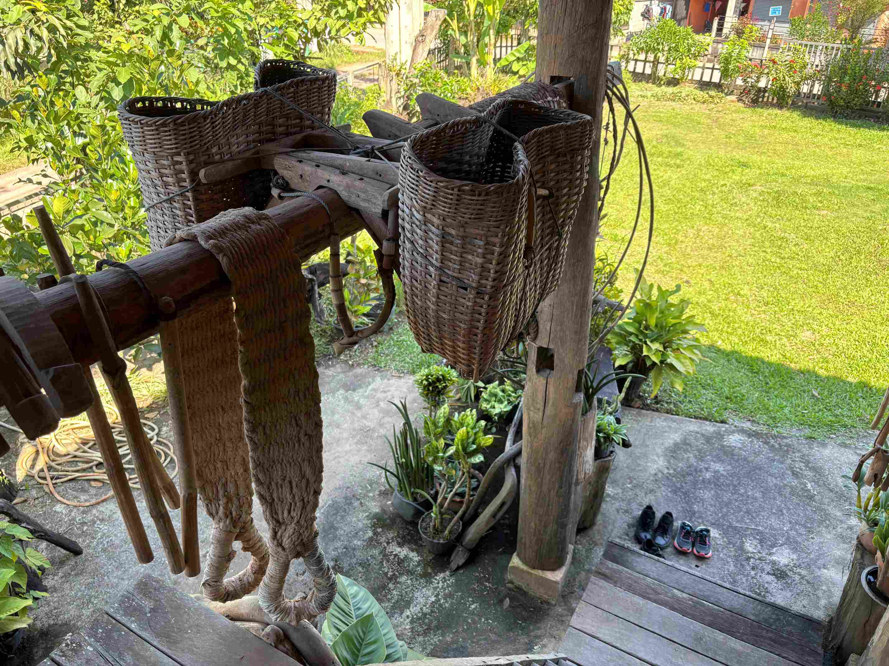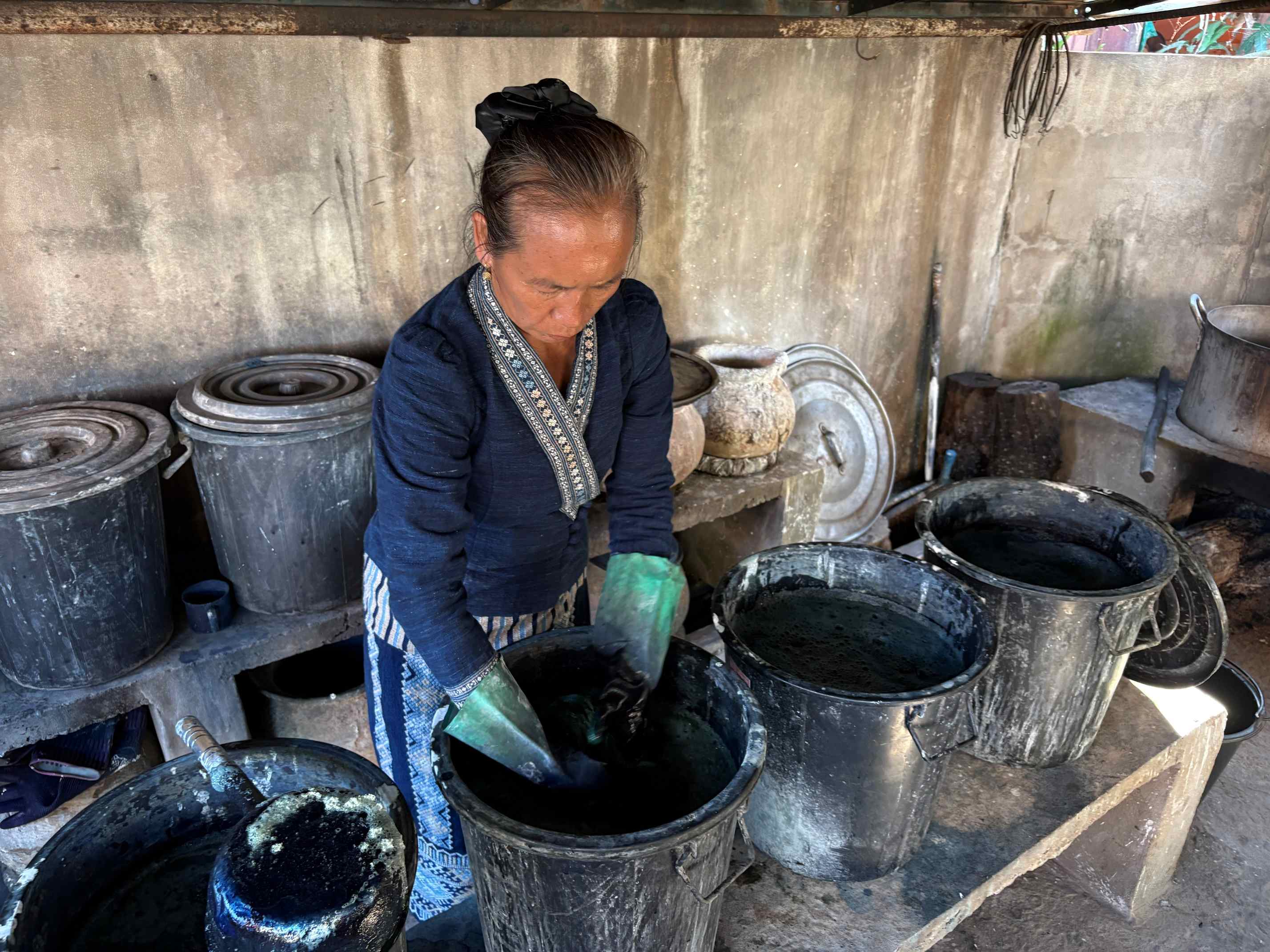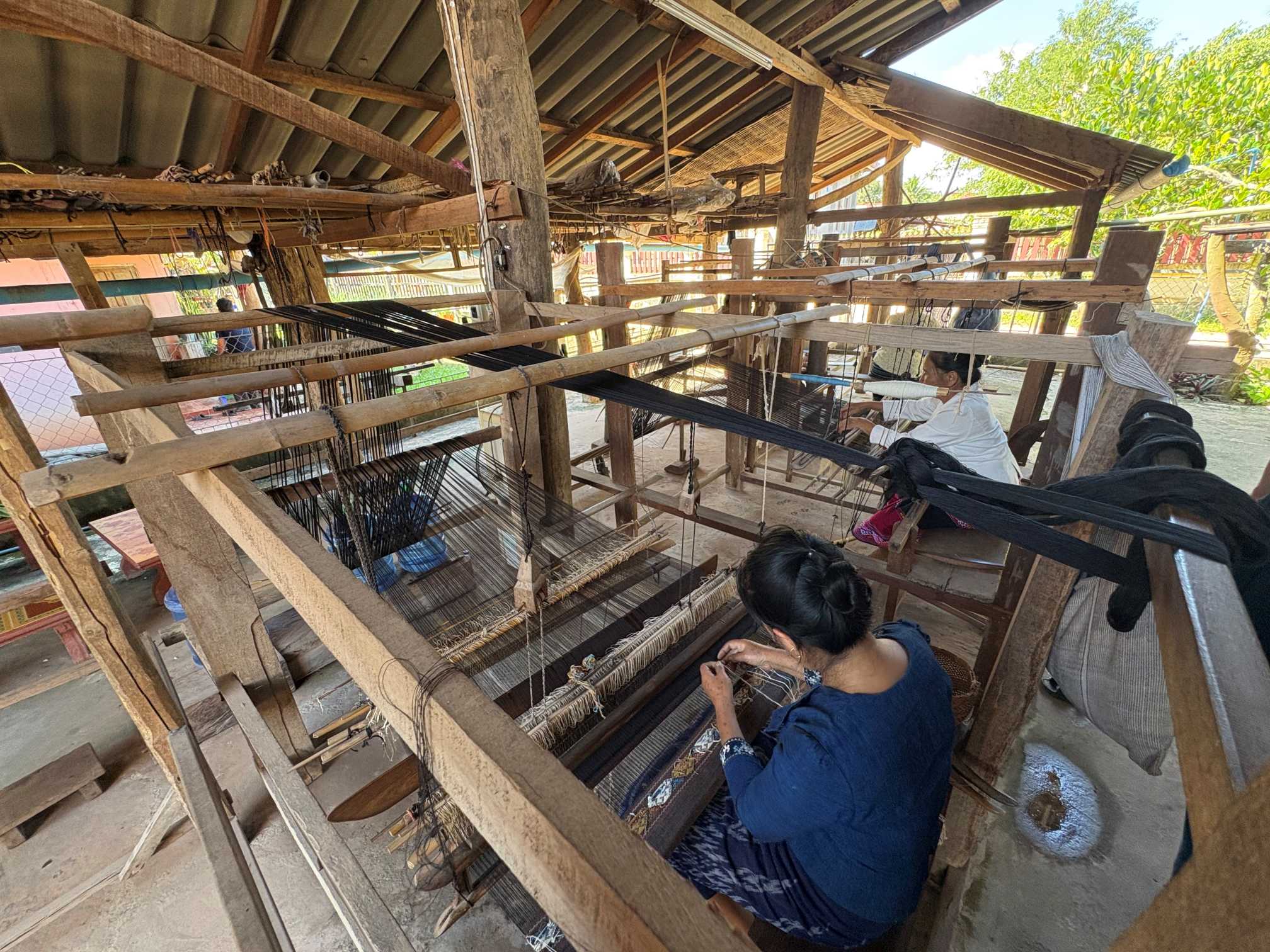サイニャブリ県は、ラオスの北西に位置しています。サイニャブリ県ではラオ族の他、タイルー族の人々が多く住んでおり、「綿の栽培・藍染」と「象との共生文化」が特徴の一つです。伝統的には、自ら綿を育て、紡ぎ、藍で染めた衣装を作っていました。特に、藍染は、発酵させた天然藍で繰り返し染めることで深みのある色を生み出すことができます。織りについては、象や花などの文様を特徴としています。現在でもホンサー郡では、伝統的な高床住居の下には織機が並んでおり、手紡ぎ綿と天然藍を用いた布作りが行われています。