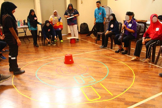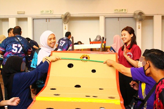 床にある的に向かって上下逆さまにしたバケツを滑らせ、高得点を狙うゲームです。多くの人から見つめられる中、中心の100点にバケツがおさまると、グループメンバーだけでなく、観戦していた他の人からも大歓声が上がりました。一方、バケツがひっくりかえると0点です。その時も”Alamak!” (あらまぁ!)と残念がる声が上がり、多くの人が一緒になって盛り上がっている様子を感じました。