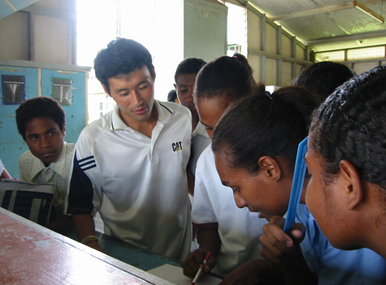 その後、大学院を修了して海外協力隊に参加し、パプアニューギニアで理数科教師としての活動が始まりました。教材や実験器具もない中で工夫を重ねながら、週30コマ以上を担当していました。