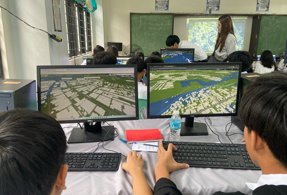 この授業は東北工業大学(仙台市)の小野桂介講師が、KDDI財団の助成を受けた「モンスーンアジア途上国における洪水防災教育プロジェクト」で作成された3D仮想モデルを活用して、洪水災害に対する備え(preparedness)の強化を目的に実施しました。生徒たちが体験したジェネラルトリアスの街は、前述の円借款事業で解析した浸水深想定や地形データで作られた3D都市データが活用されました。ここに、マインクラフトでお馴染みの家屋や建物ブロックを組み合わせ、リアルな街並みを再現しました。生徒たちはゲームの中で自分が住んでいる地域を探し、洪水が起きたら自宅の周りがどこまで浸水するのかを確認しました。3D仮想モデルで実際の街並みを再現することで、生徒たちは親近感を持ったり、洪水が発生すると街がどうなってしまうかを具体的にイメージできたりしたようです。教室では、真剣ながらも楽しんで防災を学ぶ生徒たちの姿が見られました。