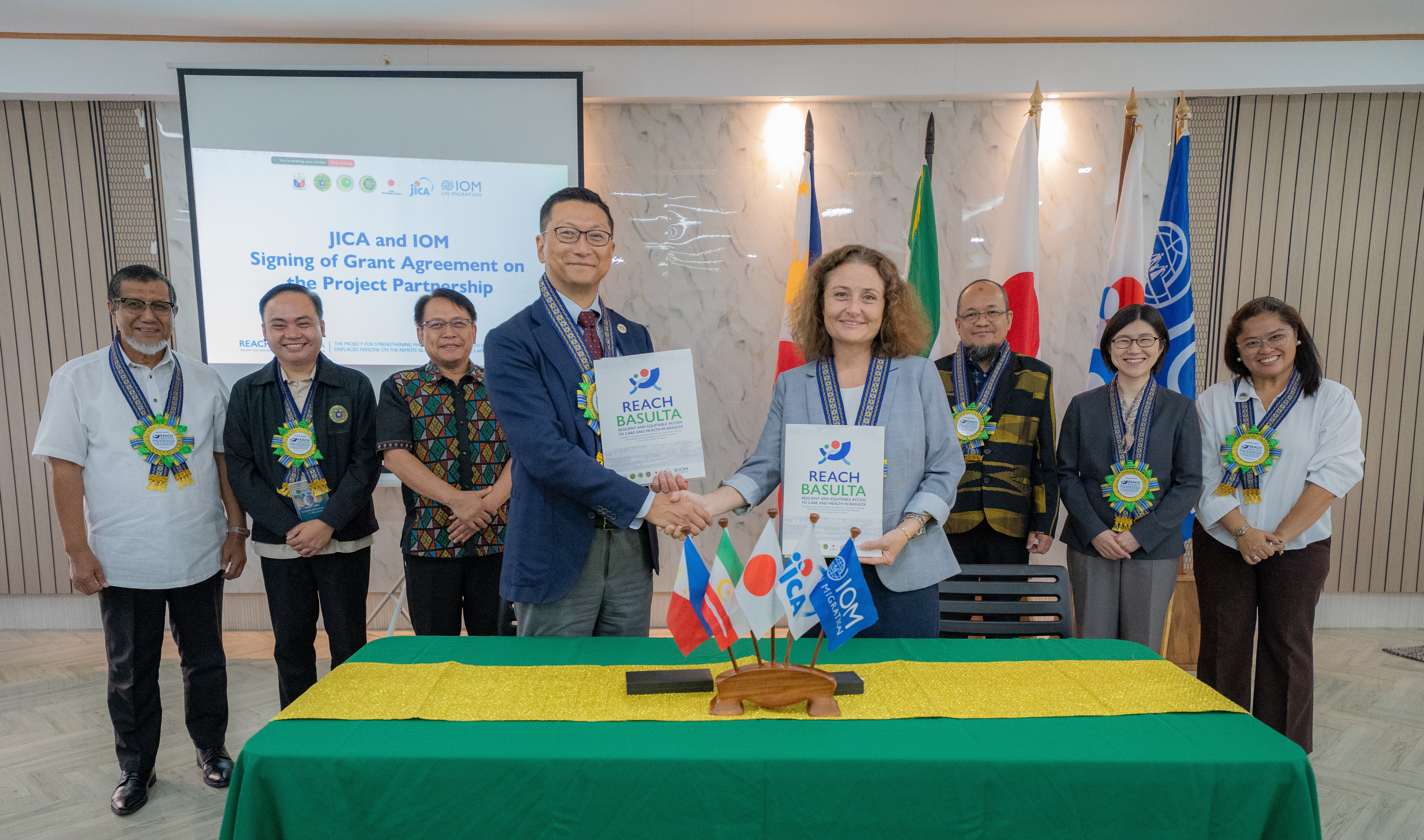 署名式には、馬場隆JICAフィリピン事務所長、トリスタン・バーネットIOMフィリピン事務所代表の他、バンサモロ・ムスリム・ミンダナオ自治地域(BARMM)のシノリンディンBARMM保健省大臣や、BARMM計画開発庁、フィリピン政府保健省、和平・和解・統合担当大統領顧問室の関係者が立ち会いました。