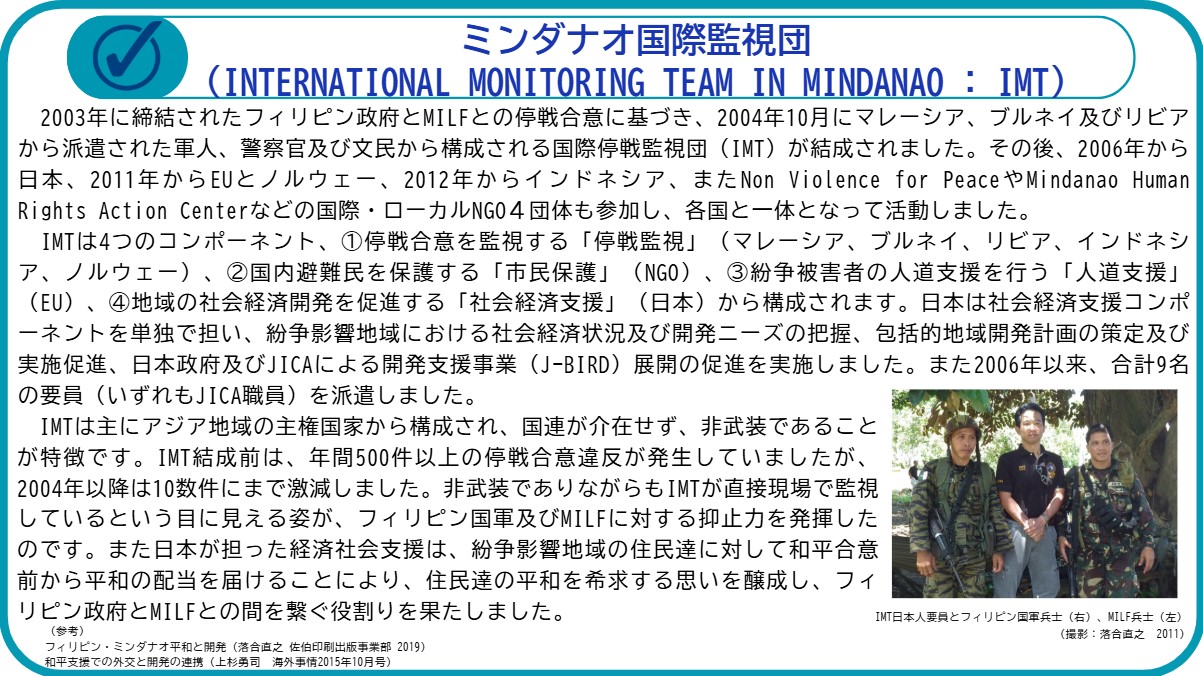 2002年12月、小泉総理(当時)が「平和と安定のためのミンダナオ支援パッケージ」を発表。その後、2006年7月には日比国交正常化50周年を記念し、麻生外務大臣(当時)が新たなミンダナオ支援策を表明し、2004年に結成された国際停戦監視団(IMT:International Monitoring Team)への要員派遣を開始するなど、日本政府による包括的な支援を本格化させました。