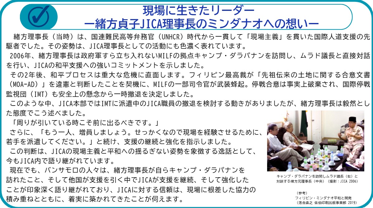 さらに、緒方理事長はマニラにてアロヨ大統領(当時)とも面談を行い、開発支援がミンダナオ和平を後押しするものであるとの認識について、政府・モロ・イスラム解放戦線双方から同意を得ました。この一連の行動は、JICAのミンダナオ支援が、和平と開発を結びつける戦略的な取り組みとして位置づけられる大きな転機となりました。