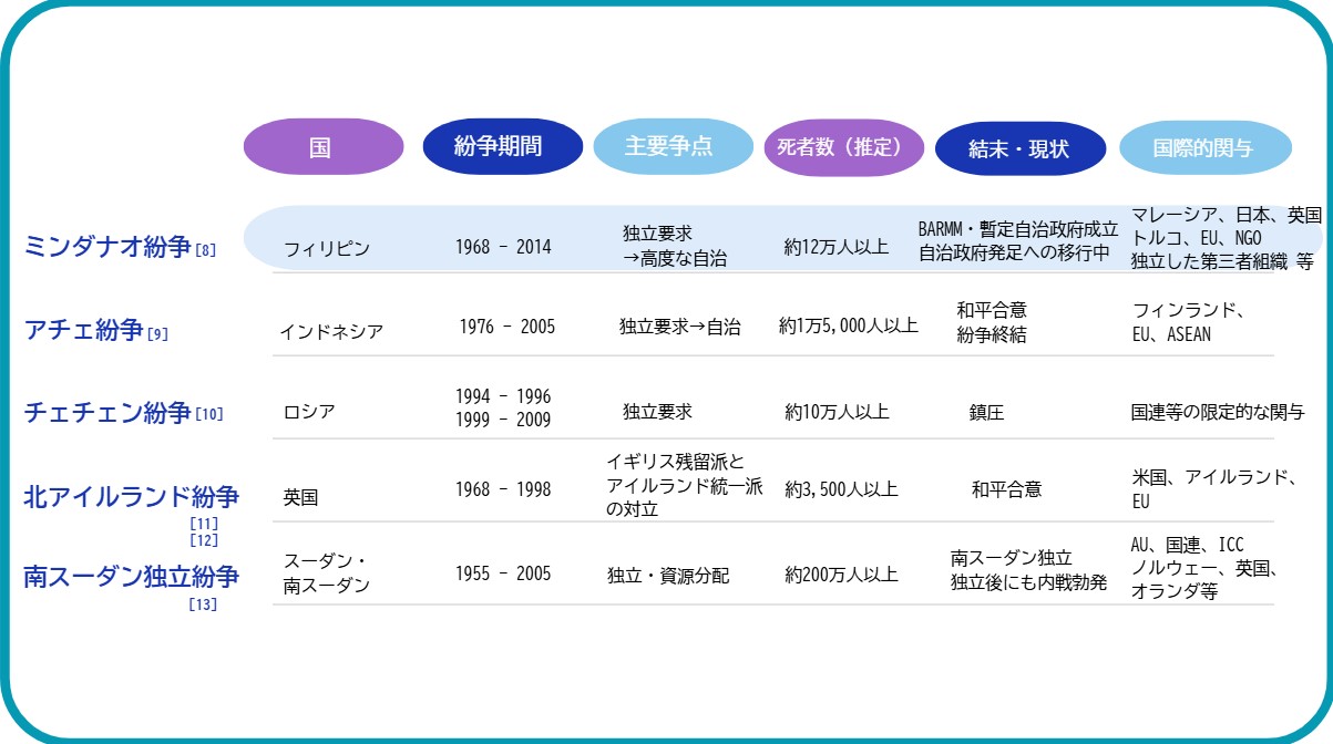 下の表は、アジアやヨーロッパ、アフリカで発生した紛争とその背景、国際的関与の有無などをまとめたものです。ミンダナオ紛争がいかに長期にわたり、多様な国際的支援のもとで和平プロセスが進められ、自治権の承認という形で武力紛争の解決が図られてきたことを示しています。