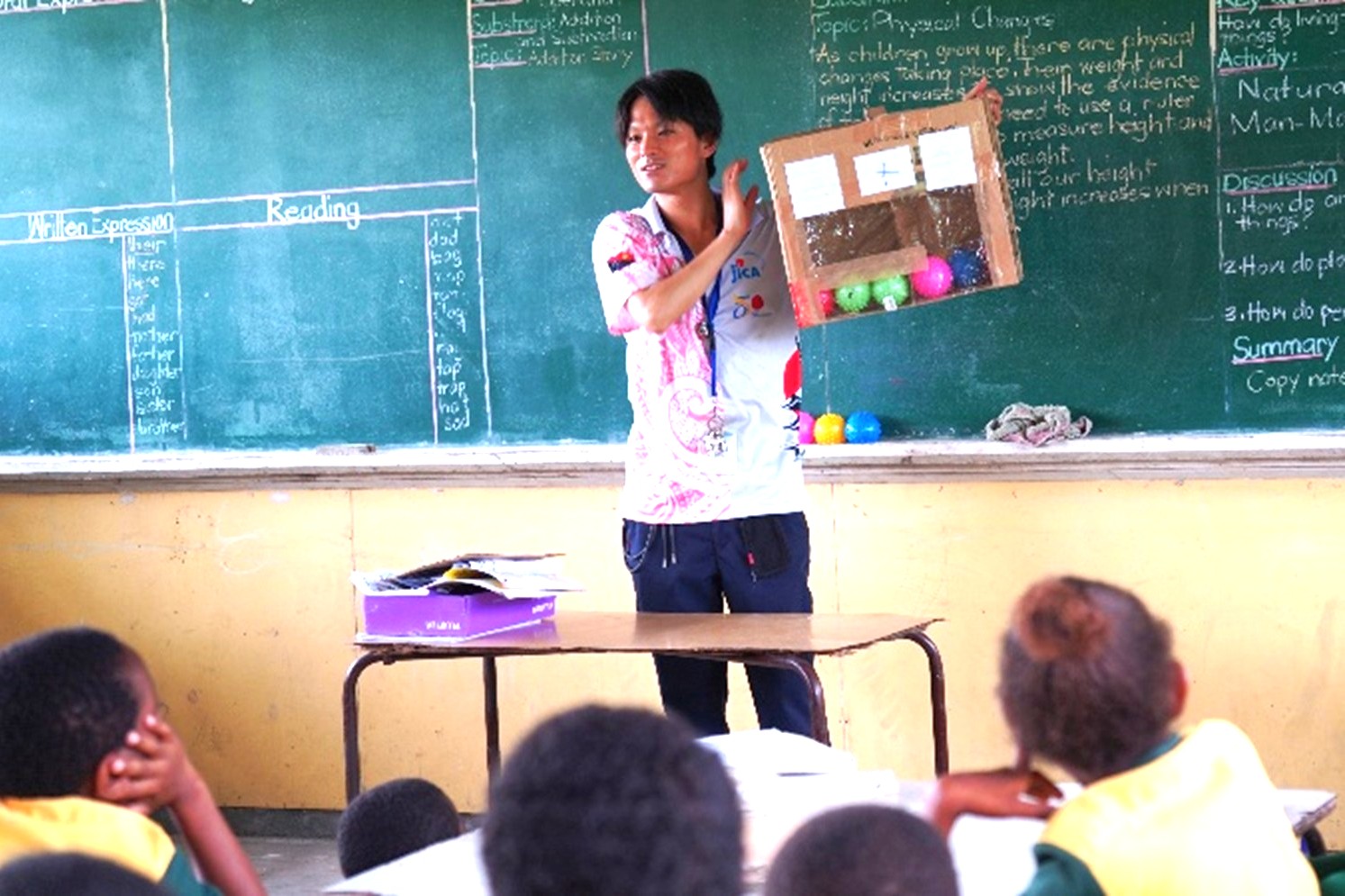 さらに、教員向けの研修では、JICAとPNG政府が共同で開発した算数・理科の教科書の効果的な活用方法を紹介しました。ポポンデッタだけでなく首都ポートモレスビーや教員養成校でも研修を実施し、教科書を活用した授業への理解を広げてきました。加えて、日本や世界とつながるオンライン授業も実施しました。世界各国の約40名の海外協力隊員にインタビューした動画を活用し、日本の子どもたちにも「国際協力とは何か」を考える授業を行うなど、世界をより身近に感じてもらう取り組みを行いました。