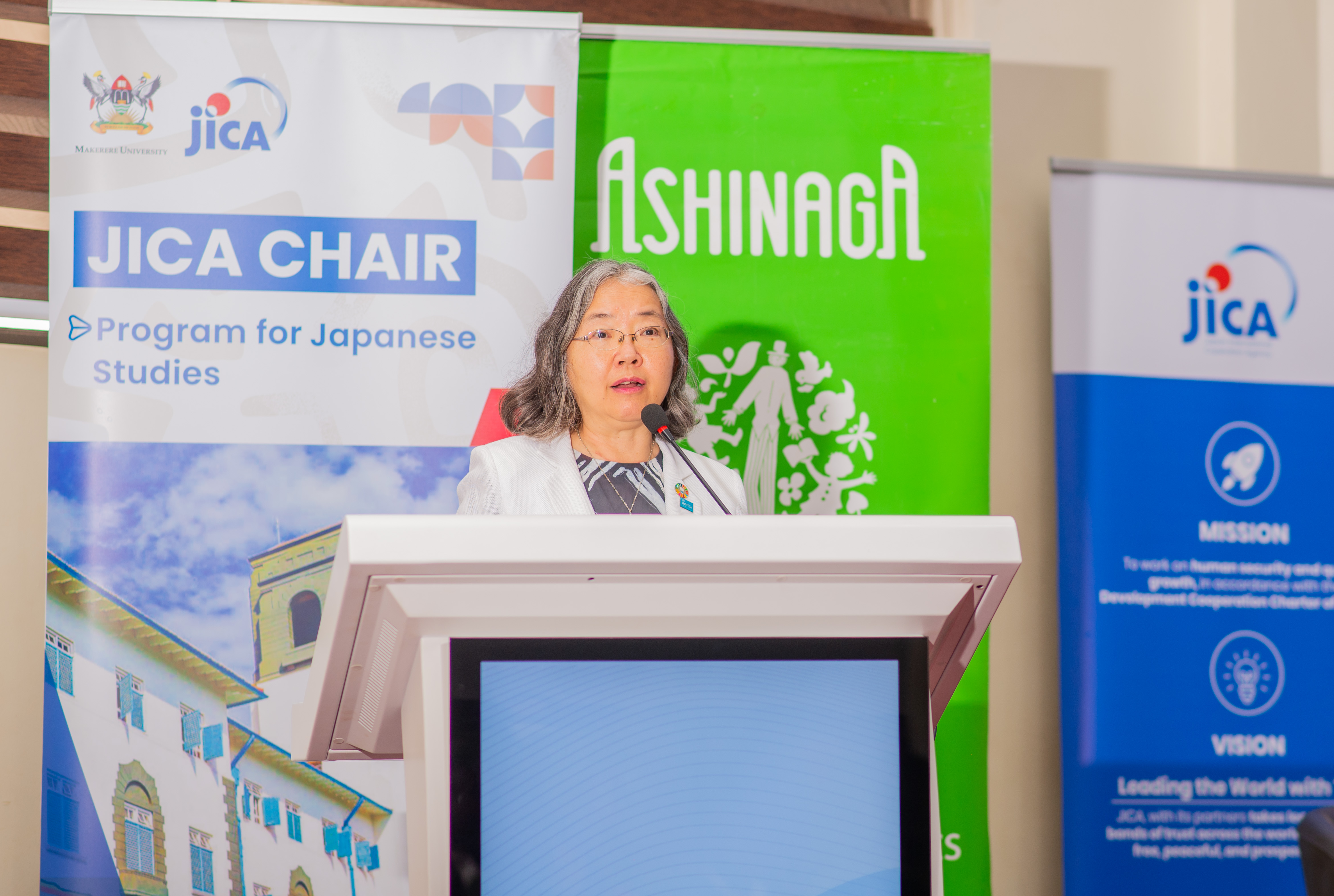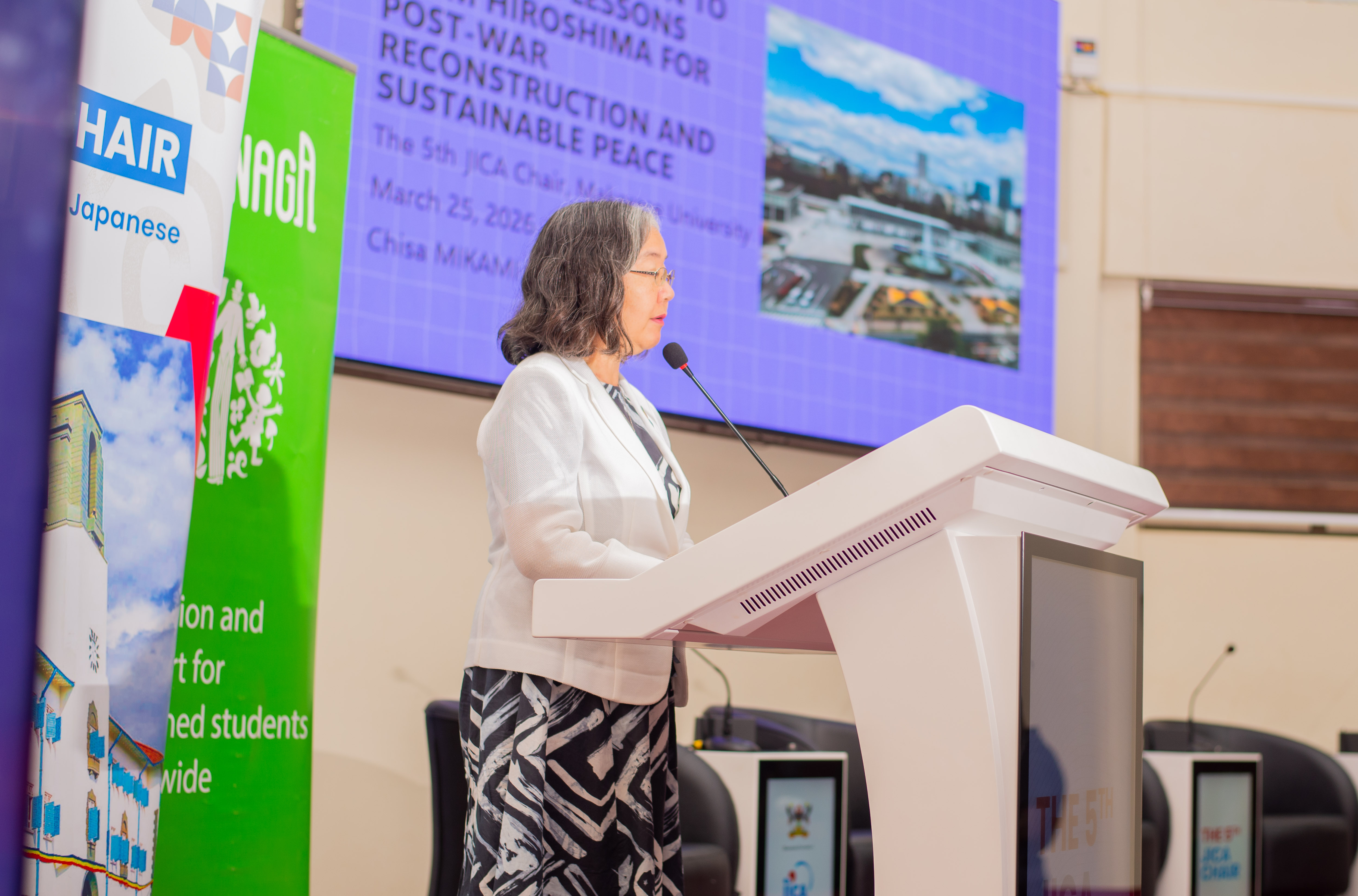 2026年3月25日、JICAウガンダ事務所はマケレレ大学において第5回JICAチェアを開催しました。今回は、国連訓練調査研究所(UNITAR)広島事務所長であり、あしなが育英会理事も務める三上知佐氏を講師として迎え、オンライン参加者を含め約200名が参加しました。