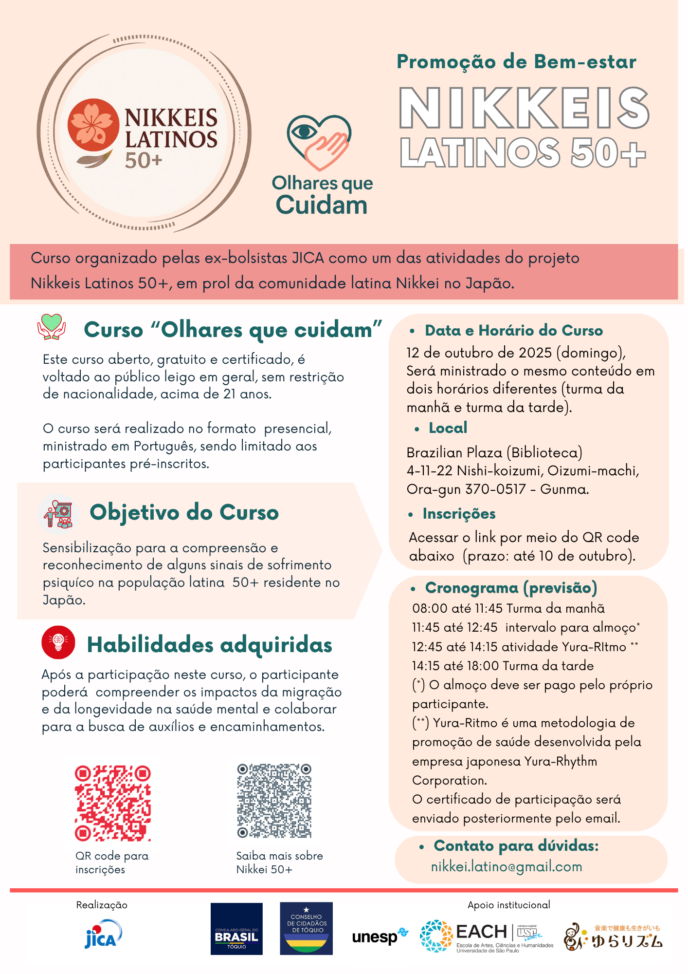 ● Curso “Olhares que cuidam”: formação de apoiadores de bem-estar mental e emocional, voltado aos leigos e voluntários que tenham interesse em colaborar na identificação de sinais de necessidades de apoio e cuidados, para direcioná-las aos serviços especializados oferecidos pela rede pública local ou pelas ONG e entidades assistenciais. Familiares de trabalhadores das fábricas e setor de serviços também poderão participar. O curso terá duração estimada de oito horas, abrangendo tópicos relacionados, dentro dos três eixos propostos pelo projeto (saúde mental, bem-estar e propósito de vida – Ikigai). Data de realização: 12 de outubro de 2025 (domingo). Mais informações no flyer abaixo.